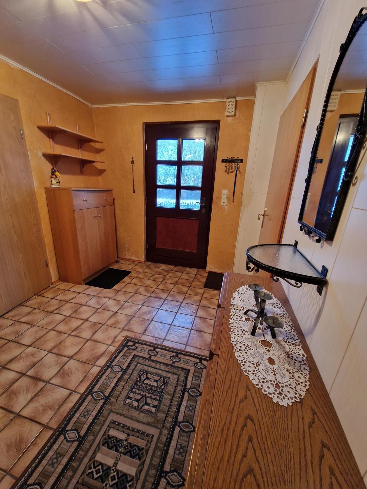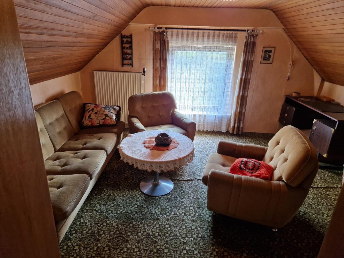 Das Obergeschoss wurde bereits ausgebaut, stellt jedoch in seiner jetzigen Form keine vollständig nutzbare Wohnfläche dar. Eine Doppelgarage bietet Platz für Fahrzeuge und zusätzliche Staumöglichkeiten. Die Ölheizung aus dem Jahr 1995 versorgt das Gebäude mit Wärme, und ein 3.000-Liter-Kunststofftank sorgt für ausreichend Heizölreserven.