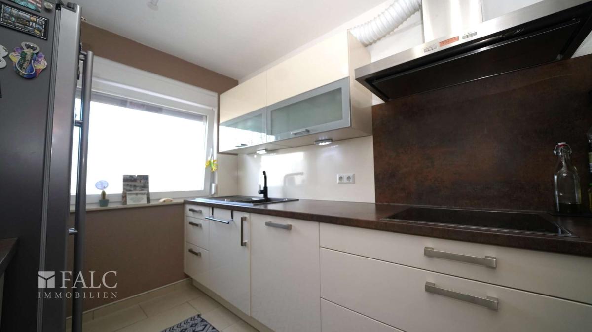 Die Küche ist mittig am langen Flur gelegen und überzeugt durch ihre moderne und hochwertige Ausstattung. Sie ist mit stilvollen Fliesen sowie einer dunklen braunen Holzarbeitsplatte ausgestattet, die farblich perfekt auf die braune Vorderwand abgestimmt ist. Das stimmige Gesamtbild macht diese Küche zum idealen Ort für Hobbyköche. Hier wurden im Jahre 2013 die Wasserleitungen bereits getauscht und im Jahr 2018 die Fliesen erneuert. Zuletzt wurde in der Küche das Fenster im Jahr 2024 gewechselt.