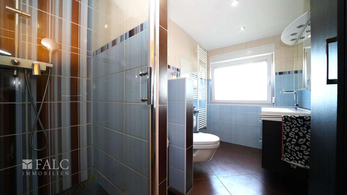 Auf der rechten Seite befindet sich das modern umgebaute Tageslichtbad. Dieses überzeugt mit einer bodengleichen Dusche inklusive großer Glastrennwand sowie einem praktischen WC und bietet ausreichend Platz für eine angenehme Morgen- und Abendroutine.