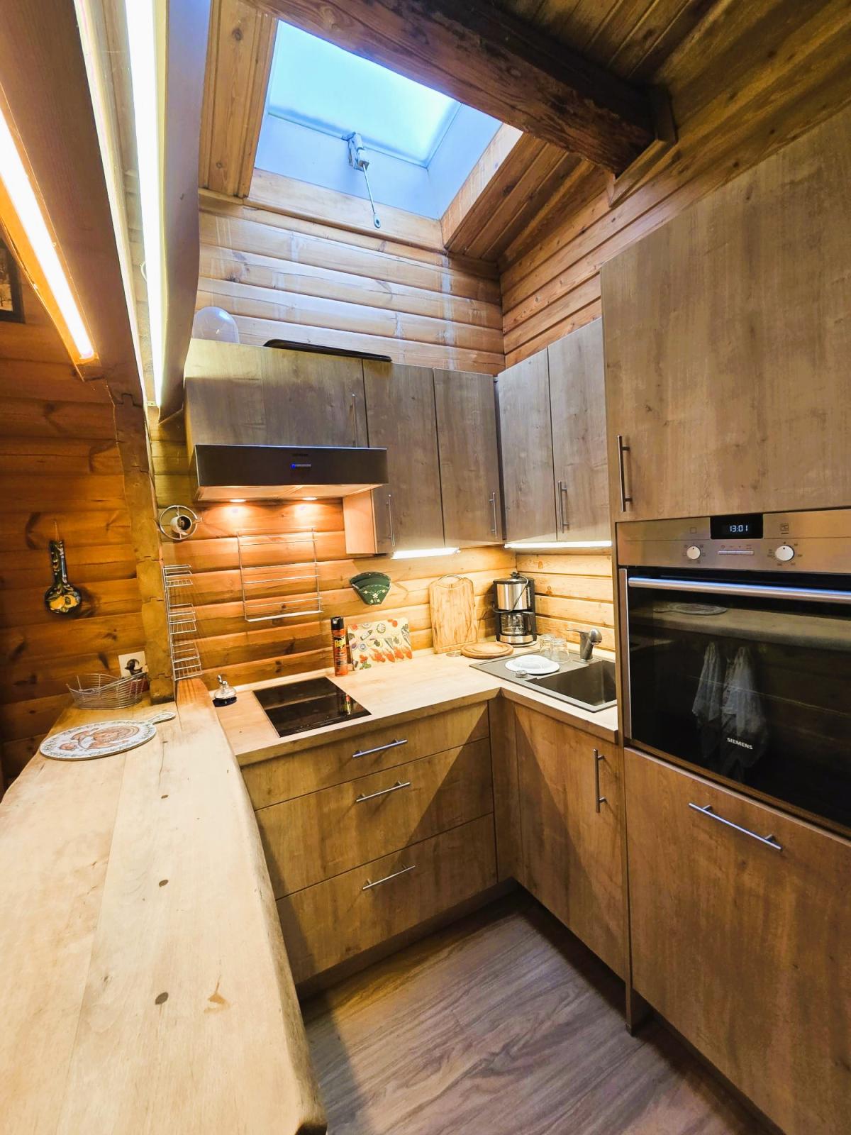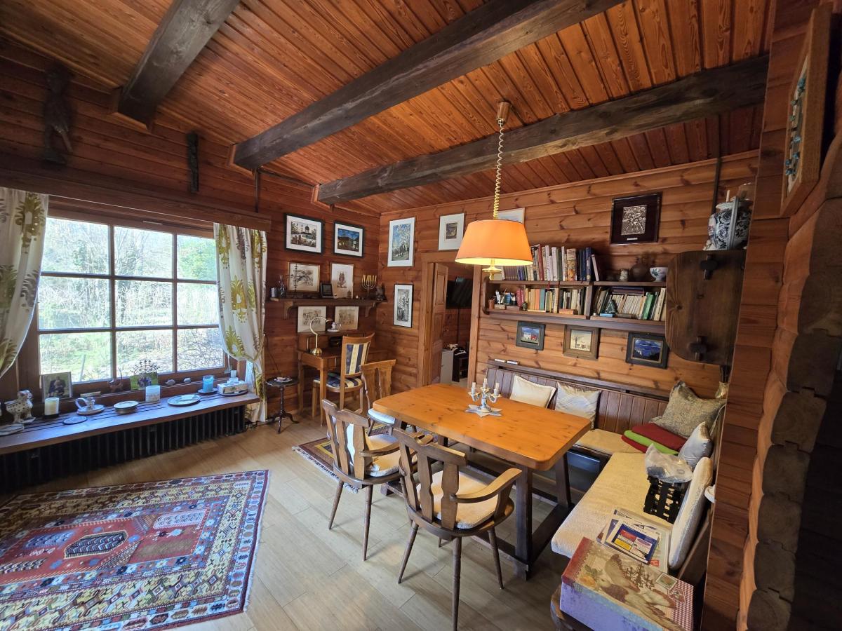 Heute präsentiert sich das kleine, aber feine Einfamilienhaus mit einer Wohnfläche von circa 61 m² mit seiner kompakten Unterteilung in 3 gut geschnittene Räume, einer zentralen offenen Küche mit Küchentresen, einem modernen Badezimmer mit Bodengleicher Walk-In-Dusche, Flur, gemütlichen Wohnbereich mit offenem Innen-und Außenkamin und Zugang zu einer ca. 20 m² großen Hochterrasse mit Südwestausrichtung in einer dem heutigen Zeitgeist entsprechenden ökologischen Holzbauweise in einem einzigartig-charmanten Wohnambiente mit hohem Wohlfühlfaktor. Der Innenbereich mit seinen Holzdecken und -wänden und das prasselnde Kaminfeuer vermitteln Wärme, Behaglichkeit und Geborgenheit.
