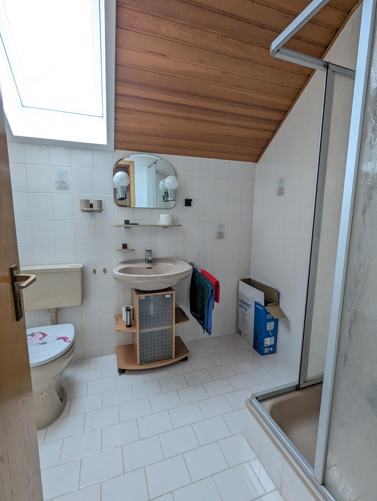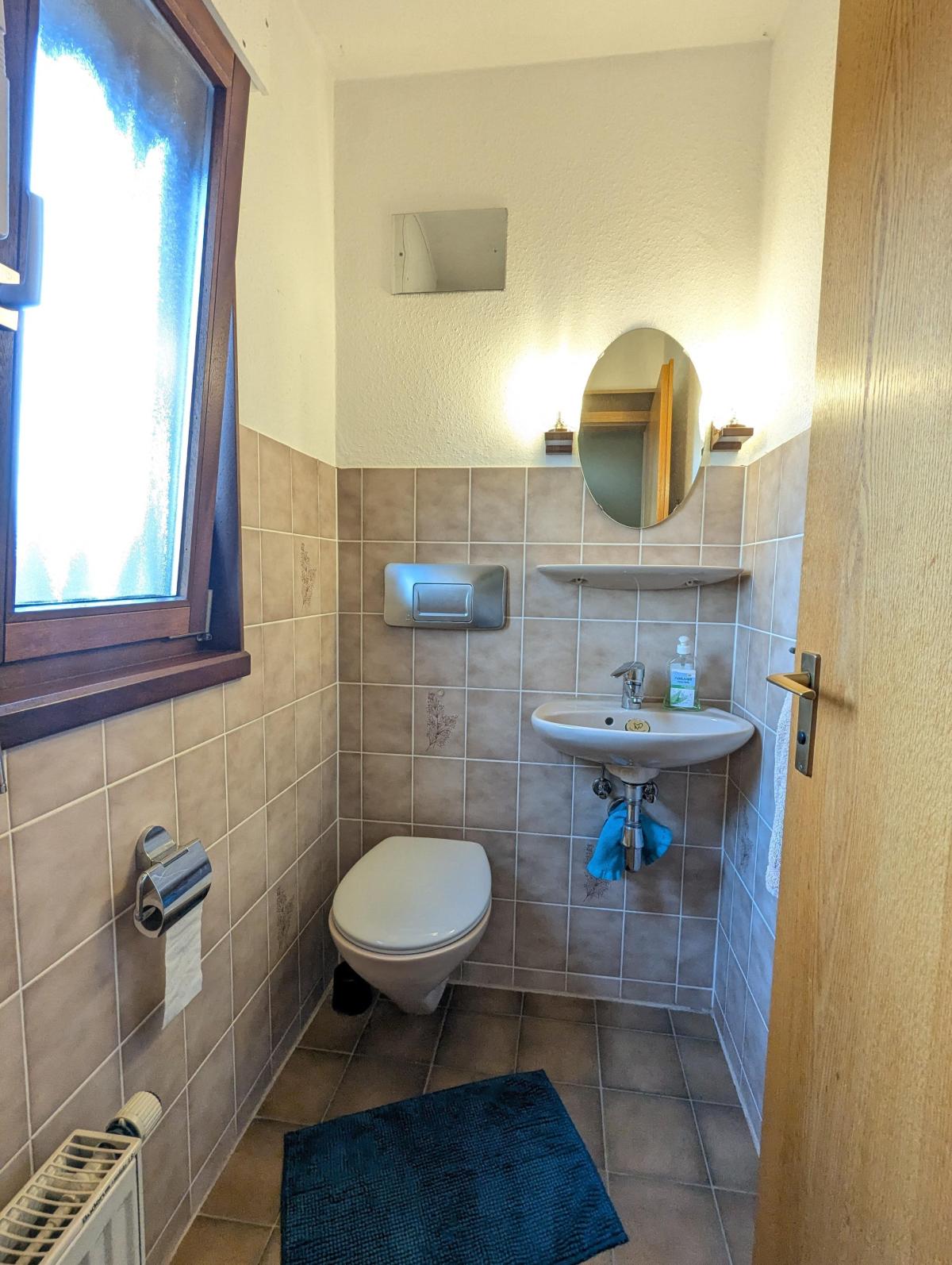 Neben einem Gäste-WC direkt neben dem Hauseingang befindet sich zwischen dem Schlaf- und Kinderzimmer ein vollständig ausgestattetes Bad mit Wanne und Dusche.