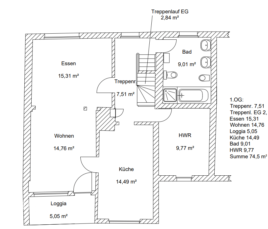 Das kleine Bad ist mit WC, Waschbecken und Dusche vollständig ausgestattet. Dadurch sind die Räume im Erdgeschoss auch unabhängig von den oberen Etagen gut nutzbar. Über eine stilvolle Treppe gelangen Sie in das Obergeschoss, wo sich zwei größere Wohnräume mit Loggia und Gartenzugang über einen Treppenabgang, eine großzügige Essküche, ein geräumiges Bad und ein Hauswirtschaftsraum befinden.