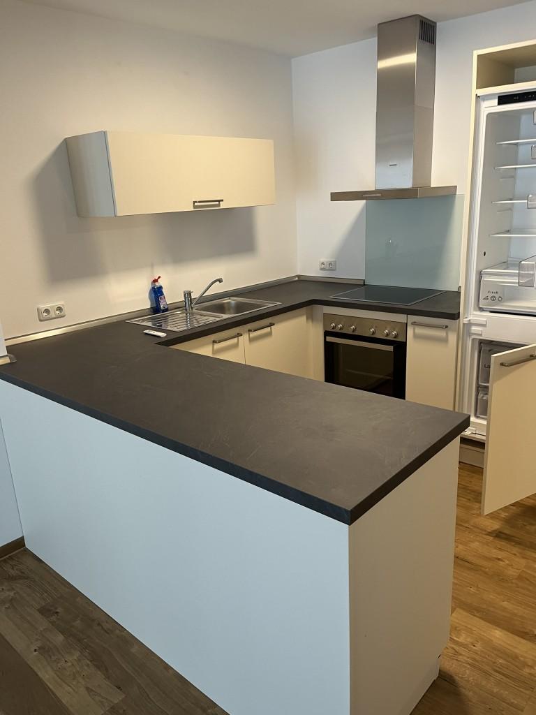Zur Wohnung gehört eine Einbauküche mit Herd, Kühlschrank und Spülmaschine.
