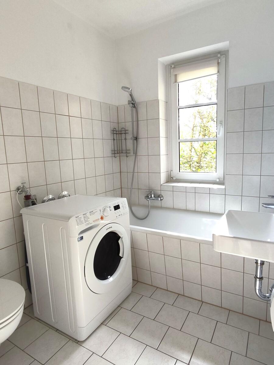 Tageslichtbad, ausgestattet mit Wanne, WC, Waschbecken und Waschmaschinenanschluss