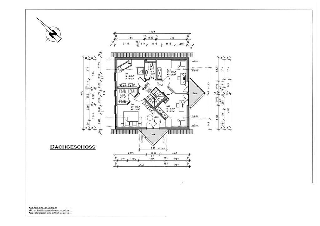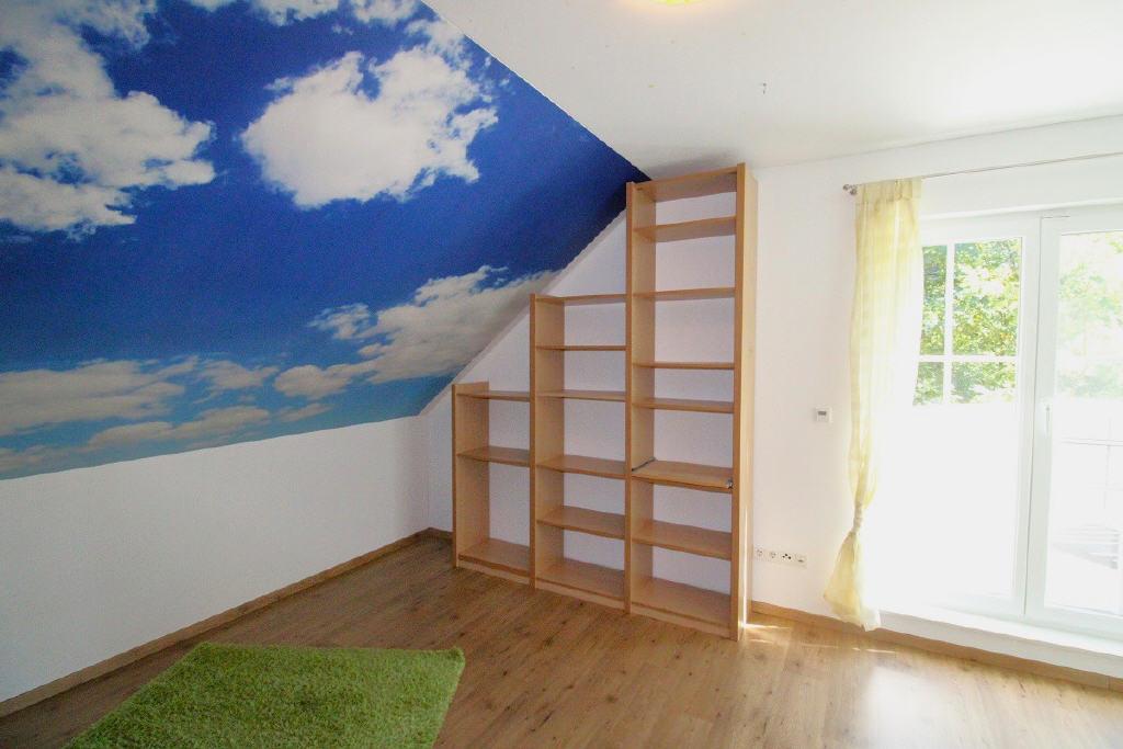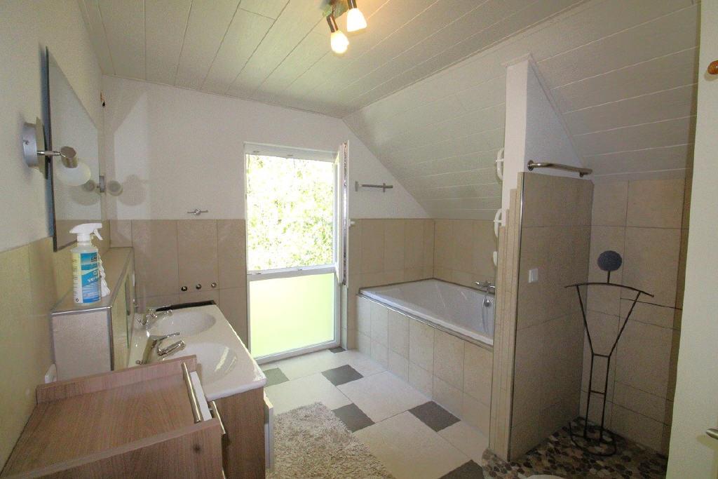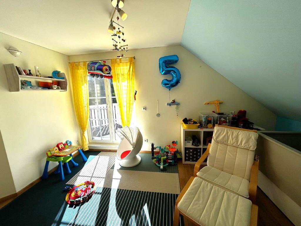 Im Obergeschoss sind ein geräumiges Schlafzimmer mit Ankleidezimmer, zwei Kinderzimmer, ein Badezimmer mit Doppelwaschtisch, Familienbadewanne, eine ebenerdige Schneckendusche, ein separates WC und zwei Balkone.