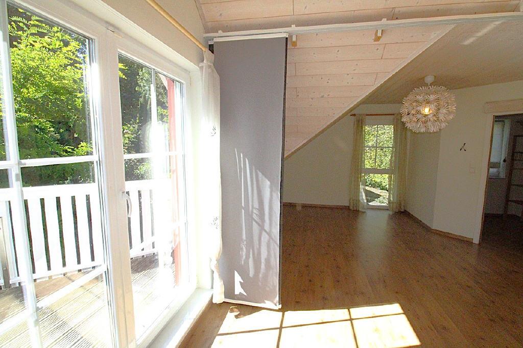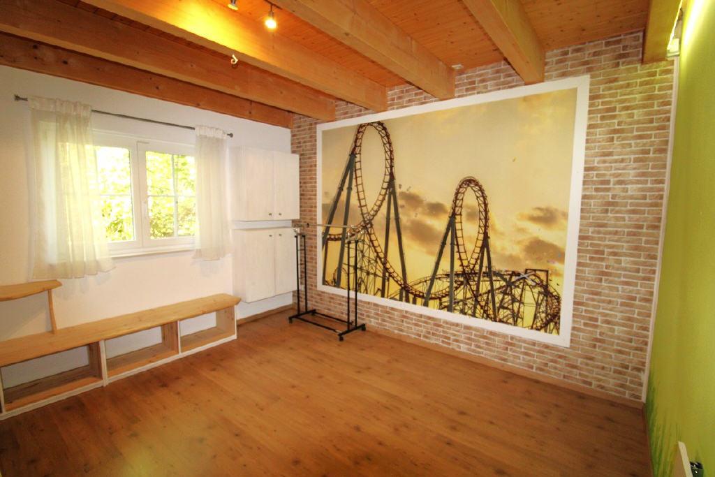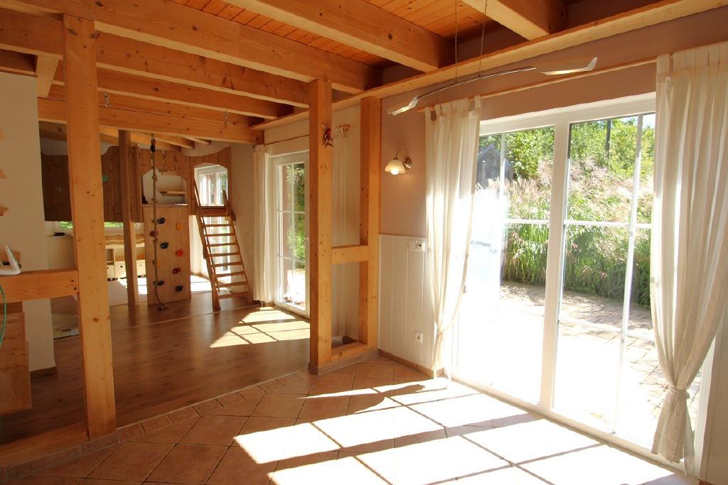Im Erdgeschoss befindet sich der offene Wohn- Ess- Kochbereich, ein Kinderzimmer und ein WC. Durch den besonderen Grundriss des Hauses und der schönen Sichtholzbalkendecke entsteht hier ein Wohntraum mit viel Platz.