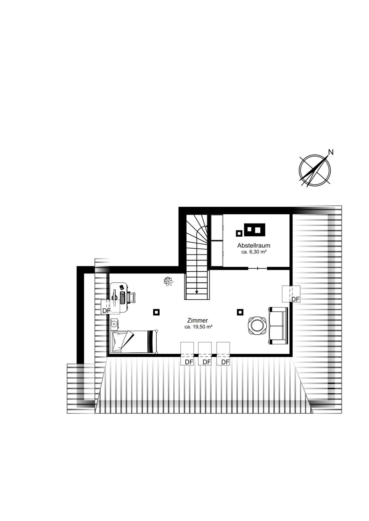 Über die Holztreppe gelangen Sie in das im Jahre 1993 ausgebaute Dachgeschoss, welches mit einem hellen Parkettboden ausgestattet ist. Hier befinden sich ein großes Zimmer und ein praktischer Abstellraum mit allerhand Staumöglichkeiten. Fünf Veluxfenster durchfluten diesen Raum mit Licht – diese Ebene eignet sich perfekt als kreativer Hobbyraum, Gästebereich oder Paradies für Kinder.