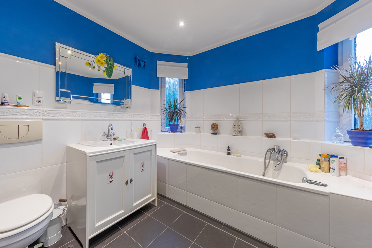Das Vollbad mit hellen Wand- und schwarzen Bodenfliesen ist mit einer großen Badewanne, einem praktischen Handtuchheizkörper sowie einem WC ausgestattet. Die beiden Fenster sorgen neben einer guten Belüftung außerdem für sehr schöne Lichtverhältnisse.