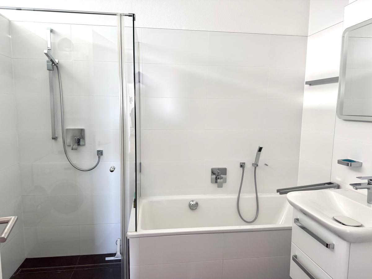 - Badezimmer mit Badewanne, Dusche und Fenster