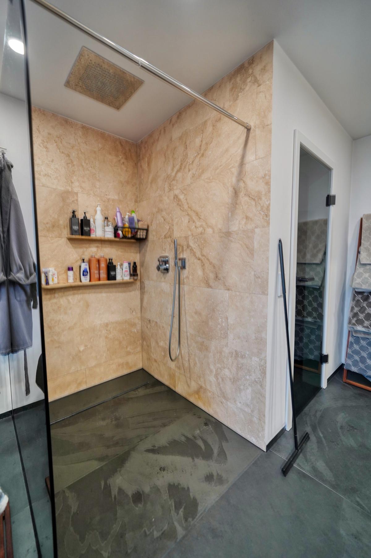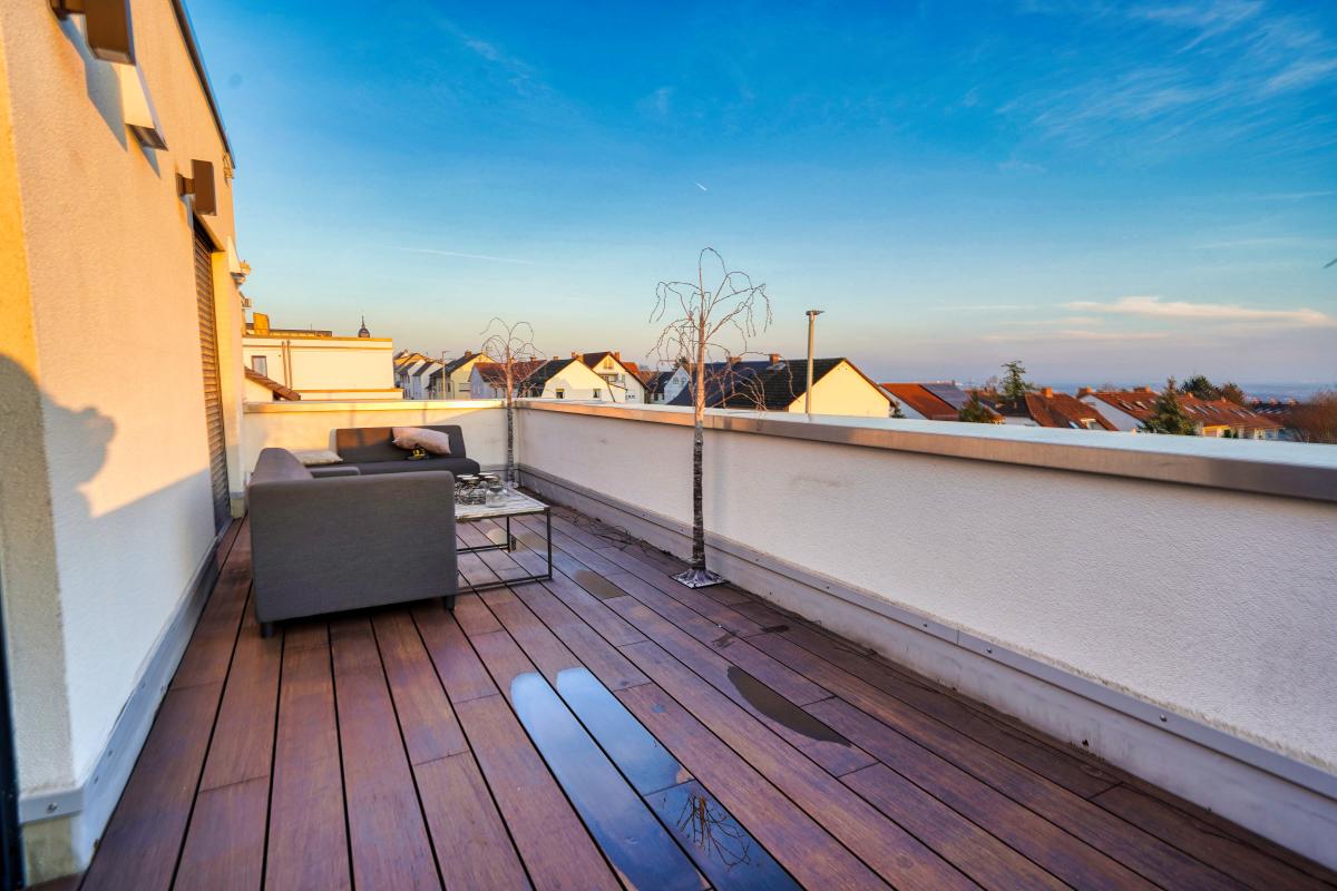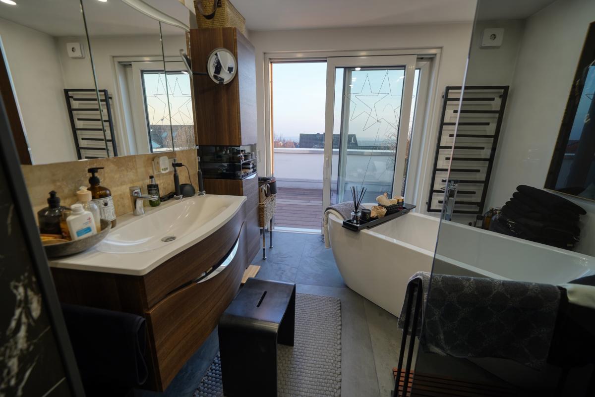 Ein besonderes Highlight bildet das vierte Badezimmer: Ausgestattet mit einer freistehenden Badewanne, einer modernen Dusche sowie einem direkten Zugang zur Dachterrasse, bietet es ein exklusives Wellnessambiente mit privatem Rückzugscharakter.