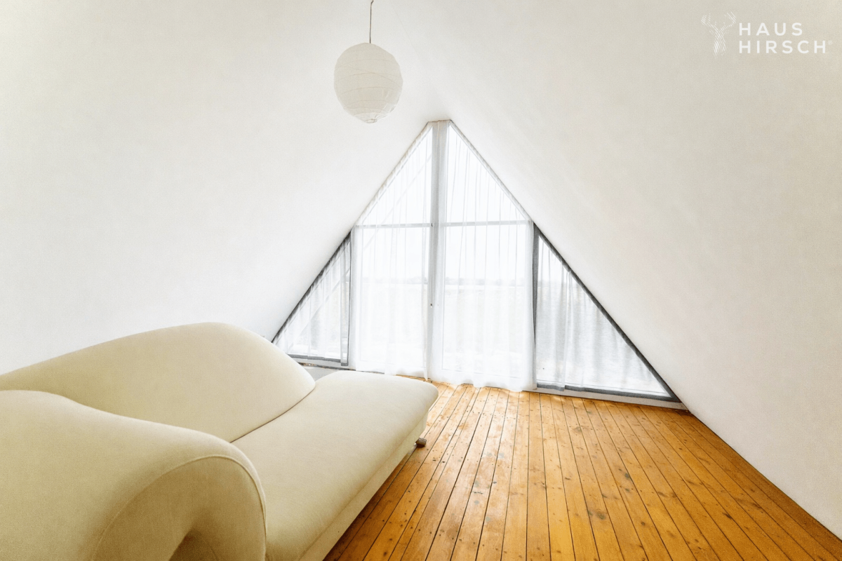 Im Obergeschoss finden Sie ein helles Badezimmer mit zwei Waschtischen und freistehender Badewanne, ein Büro, ein Schlafzimmer mit Ankleidebereich sowie einen Aufgang zum stilvoll ausgebauten Spitzboden, der als modernes Mikrostudio gestaltet wurde und trotz kompakter Fläche ein cleveres, lichtdurchflutetes Wohnkonzept bietet. Dieser Raum überzeugt zudem mit gemütlichen Holzböden und einem freien Blick über die Felder.