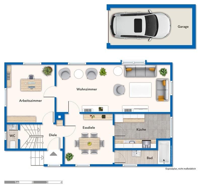 Bereits beim Betreten des Erdgeschosses spüren Sie die einladende Atmosphäre: Ein praktischer Flur, das Badezimmer, ein weiteres Zimmer, eine Küche sowie ein großzügiger Wohn- und Essbereich bilden das Herzstück des Hauses. Hier entstehen Momente – vom gemeinsamen Frühstück bis zum gemütlichen Abend mit Freunden.