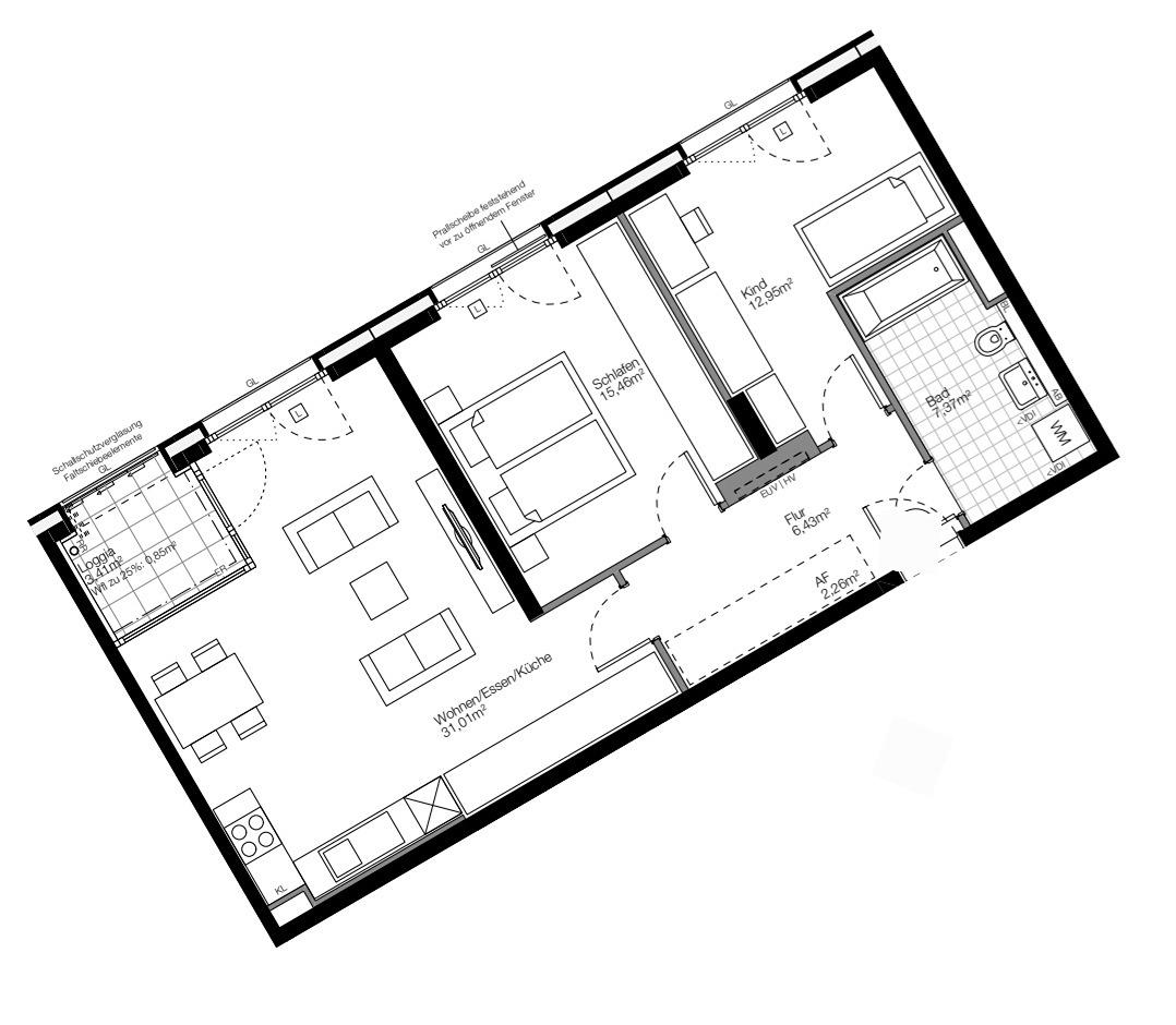 - ​Zusatz: Eigenes Kellerabteil, Tiefgaragenstellplatz sowie gemeinschaftlicher Fahrradraum und Dachterrasse zur Mitbenutzung