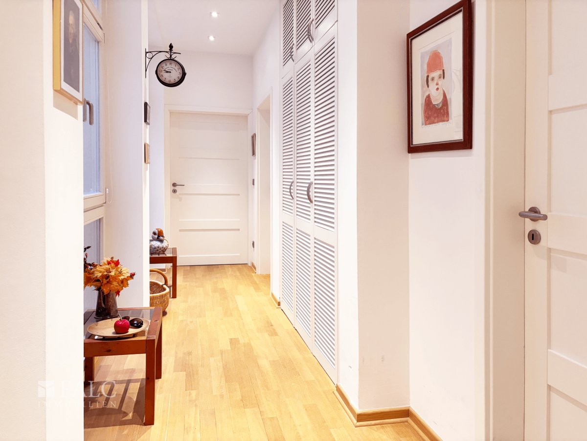 aufwändig restaurierte Wände, angenehme Raumtiefen, eine ruhige Selbstverständlichkeit. Gleichzeitig öffnet sich der Wohnraum zur geschützten Terrasse im Innenhof – ein Ort, der Ruhe ausstrahlt und den Alltag entschleunigt.