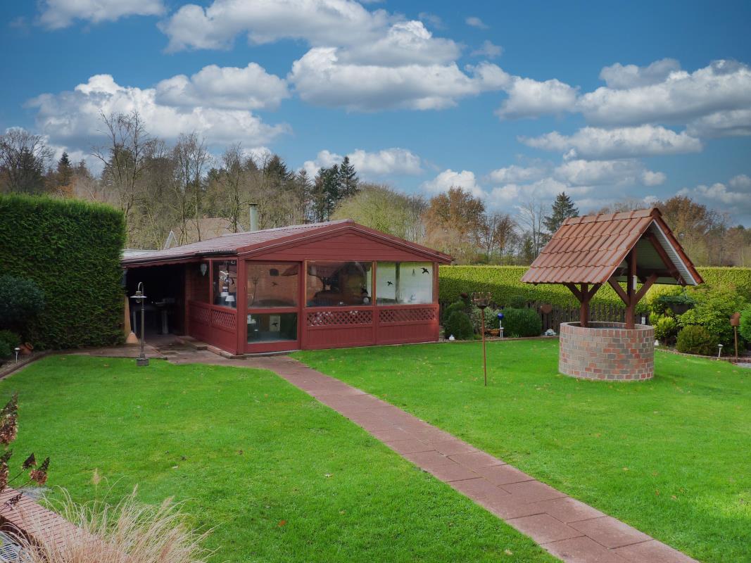 Durch den schönen und sehr gepflegten Garten geht man zu der tollen Blockhütte mit Partyraum. Hier gibt es ausreichend Fläche und Sitzmöglichkeiten, um gemütliche Stunden zu verbringen.