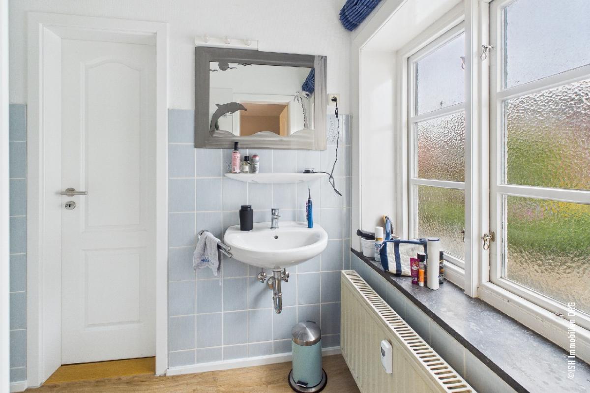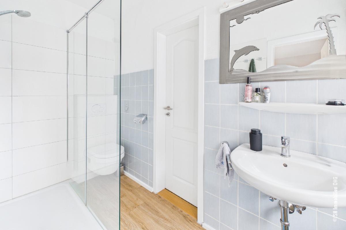 Das moderne Tageslichtbad mit Dusche grenzt direkt an das Schlafzimmer und bietet einen Durchgang in den Hauswirtschaftsraum.