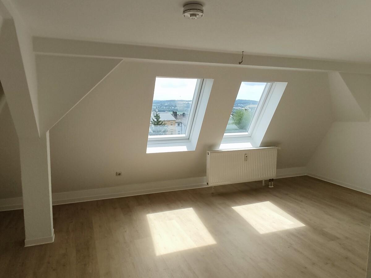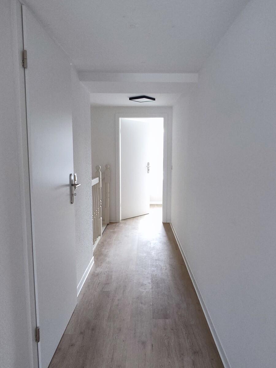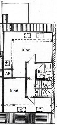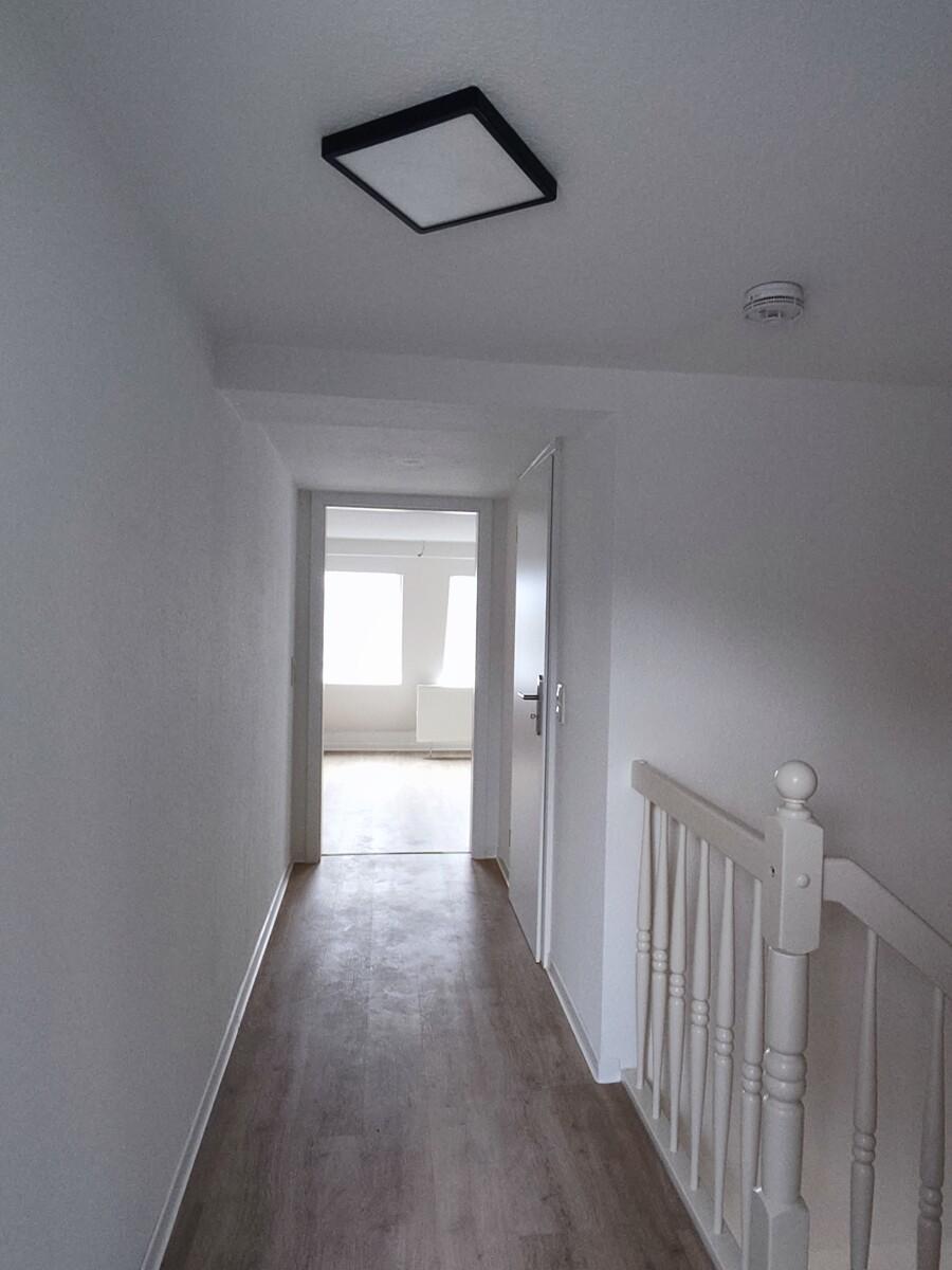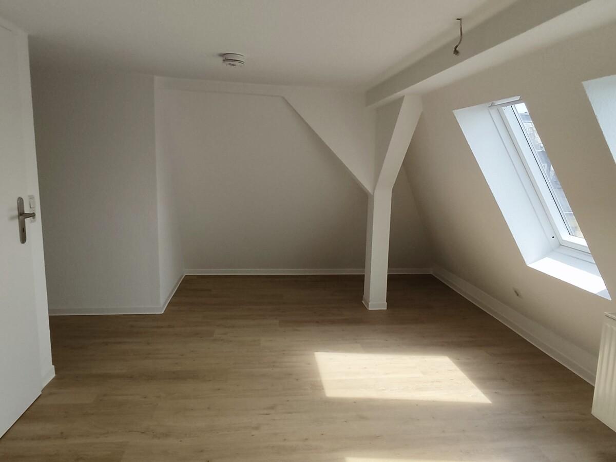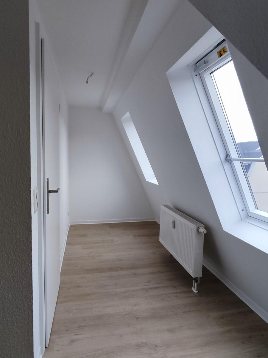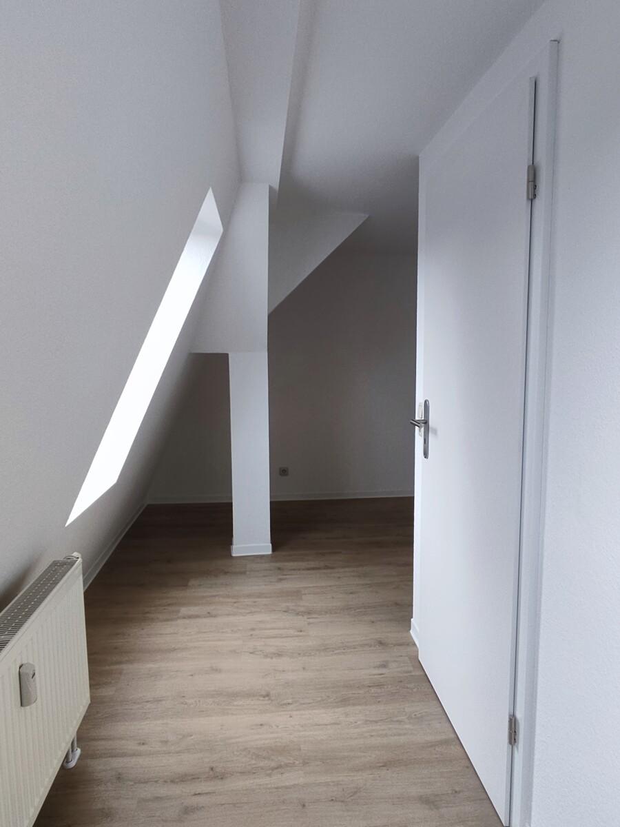 Die Dachgeschosswohnung eines gepflegten 8-Familienhauses erstreckt sich über zwei Ebenen. Die untere Etage bietet ein großzügiges Wohnzimmer mit offener Treppe, eine Küche mit Balkon zur Hofseite, ein Schlafzimmer und ein Bad. Auf der oberen Ebene befinden sich zwei Kinderzimmer, ein Abstellraum sowie ein weiteres Bad. Beide Bäder haben kein Fenster. Die Wohnung wurde frisch weiß gestrichen.