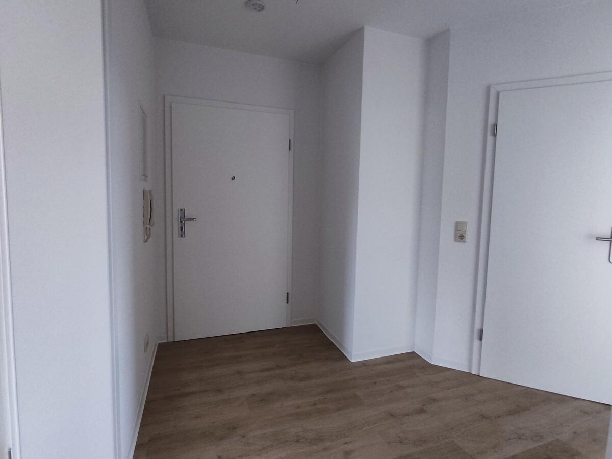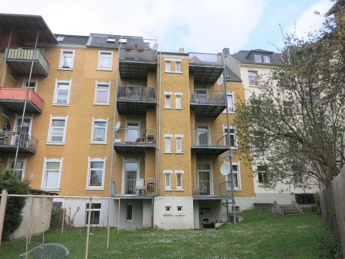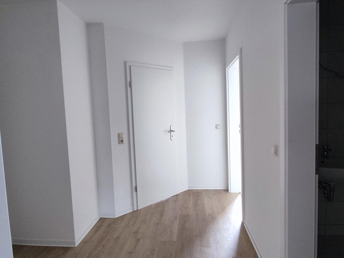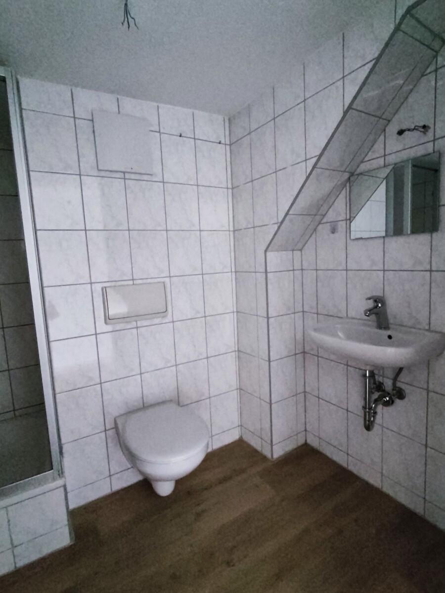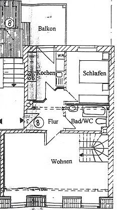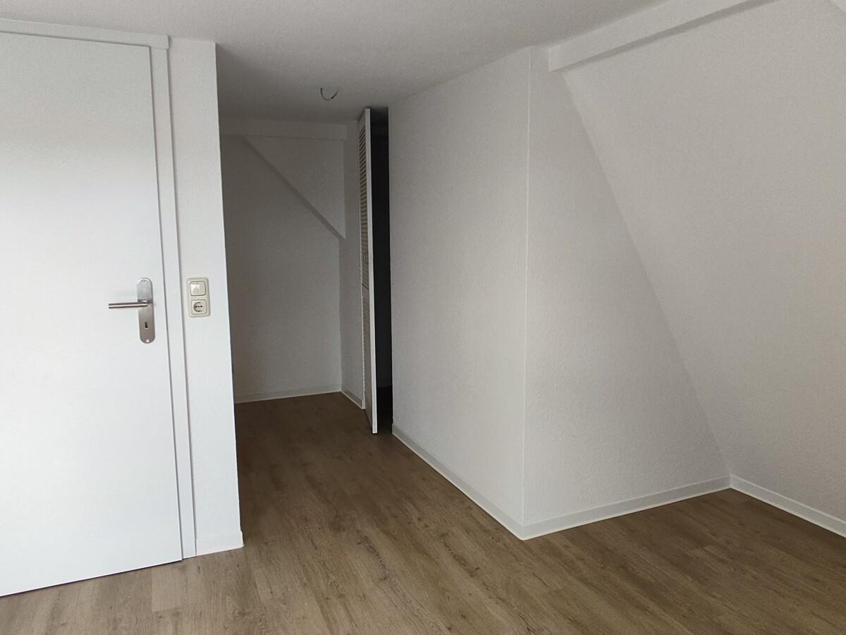 Die Dachgeschosswohnung eines gepflegten 8-Familienhauses erstreckt sich über zwei Ebenen. Die untere Etage bietet ein großzügiges Wohnzimmer mit offener Treppe, eine Küche mit Balkon zur Hofseite, ein Schlafzimmer und ein Bad. Auf der oberen Ebene befinden sich zwei Kinderzimmer, ein Abstellraum sowie ein weiteres Bad. Beide Bäder haben kein Fenster. Die Wohnung wurde frisch weiß gestrichen.