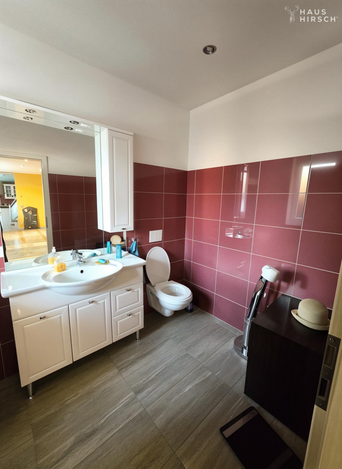 Über eine von der Küche aus zugängliche Treppe gelangt man in das Obergeschoss, das zusätzlich über einen großen Balkon verfügt. Hier befinden sich ein weiteres Gäste-WC bzw. Gäste-Duschbad sowie ein vollwertiges Badezimmer mit Duschkabine und Badewanne.