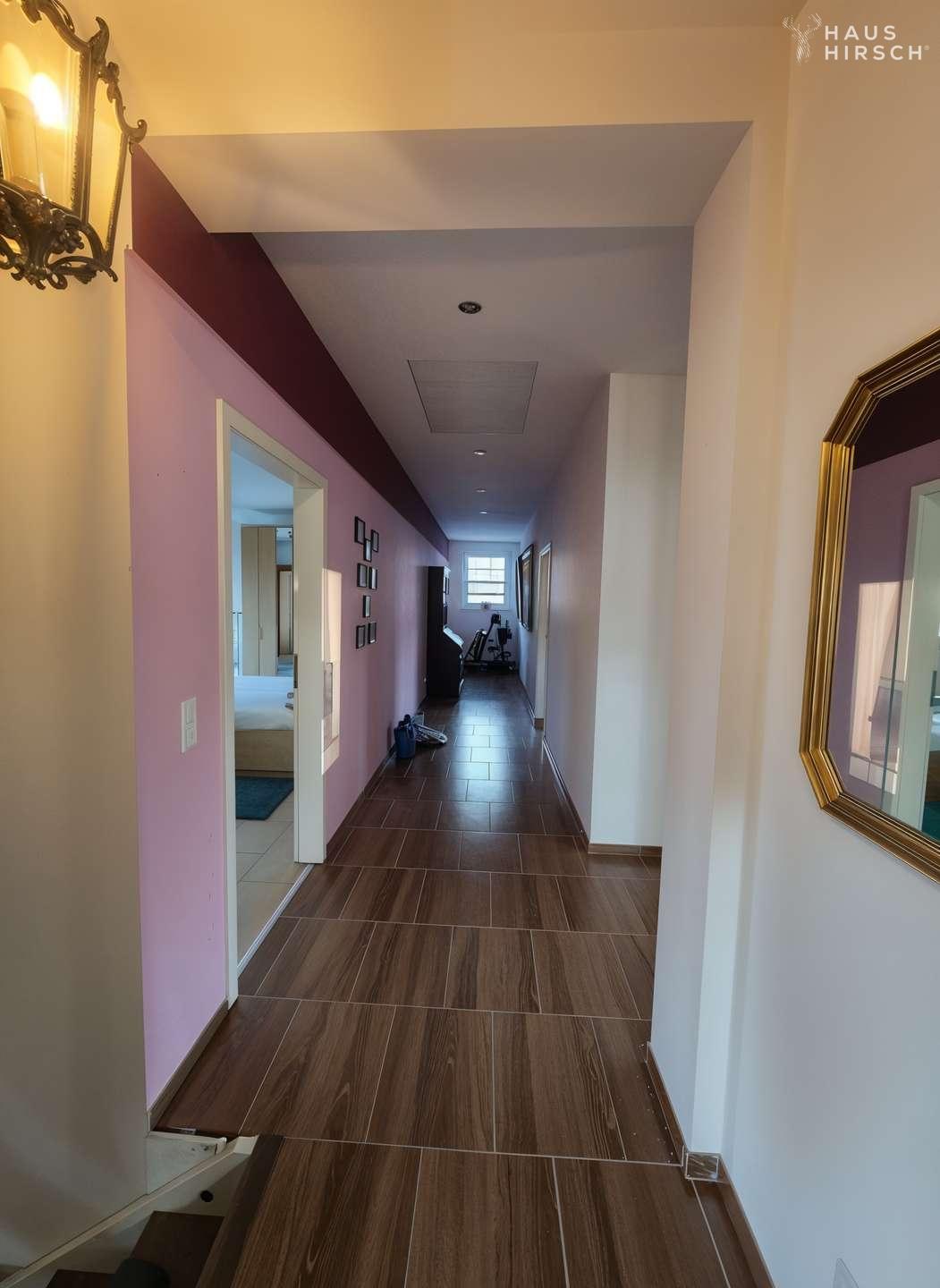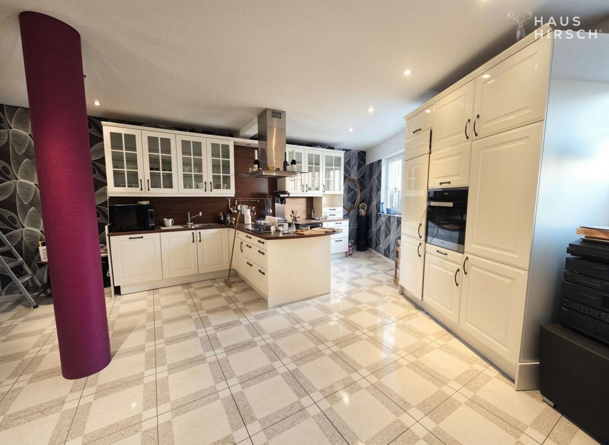 Aufenthaltsmöglichkeiten auf einer Fläche von ca. 40 m². Der angrenzende, repräsentative Wohnbereich mit Säulenarchitektur bietet mit über 60 m² ein großzügiges Raumgefühl. Direkt vom Wohnzimmer aus ist ein großer Wintergarten angebunden, der den Wohnraum erweitert und für viel Licht sorgt. Ein Gäste-WC ergänzt das Raumangebot auf dieser Ebene.