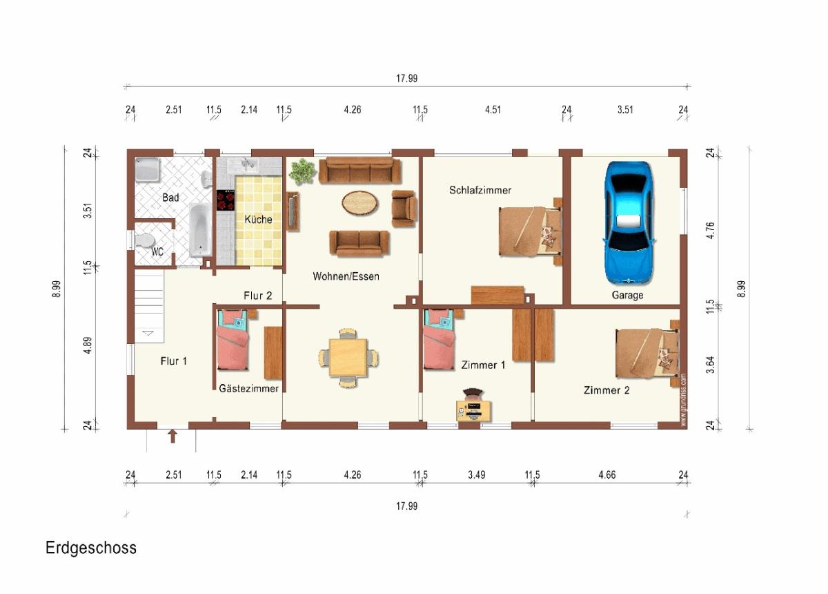 Der großzügige Wohnbereich mit angrenzendem Essbereich bildet das Herzstück des Hauses. Die separate Küche sorgt für eine funktionale Abtrennung und ermöglicht angenehmes Kochen. Zudem gibt es ein Badezimmer und ein geräumiges Schlafzimmer sowie drei weitere Zimmer, die flexibel als Kinderzimmer, Büro oder Gästezimmer genutzt werden können.