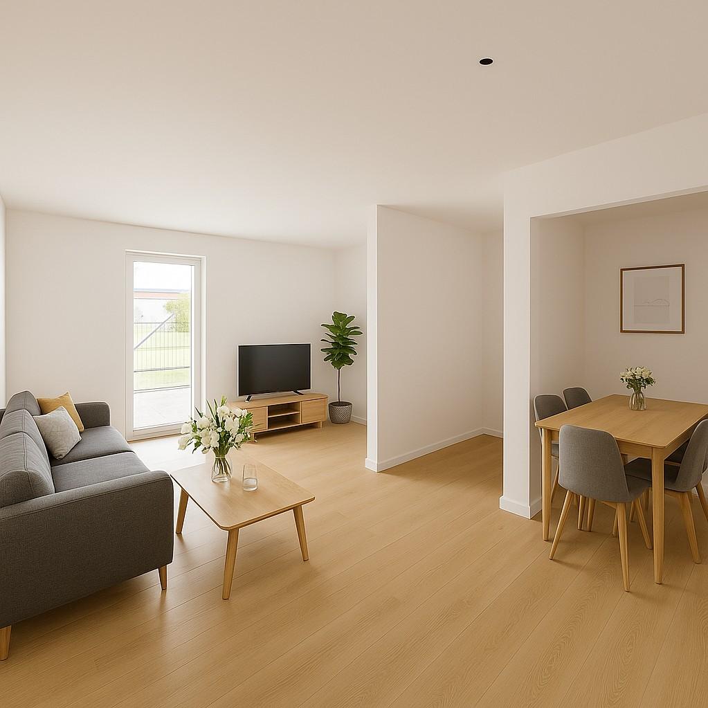 Der großzügige Wohn- und Essbereich mit offener Küche bietet Zugang zur Terrasse und dem angrenzenden Gartenbereich, welcher nach Norden und Westen ausgerichtet ist. Zur Wohnung gehört außerdem ein Schlafzimmer mit praktikablem Grundriss. Das barrierefreie Badezimmer ist mit einer Walk-in-Dusche ausgestattet. Zusätzlich gibt es ein Gäste-WC, sowie einen praktischen Abstellraum.