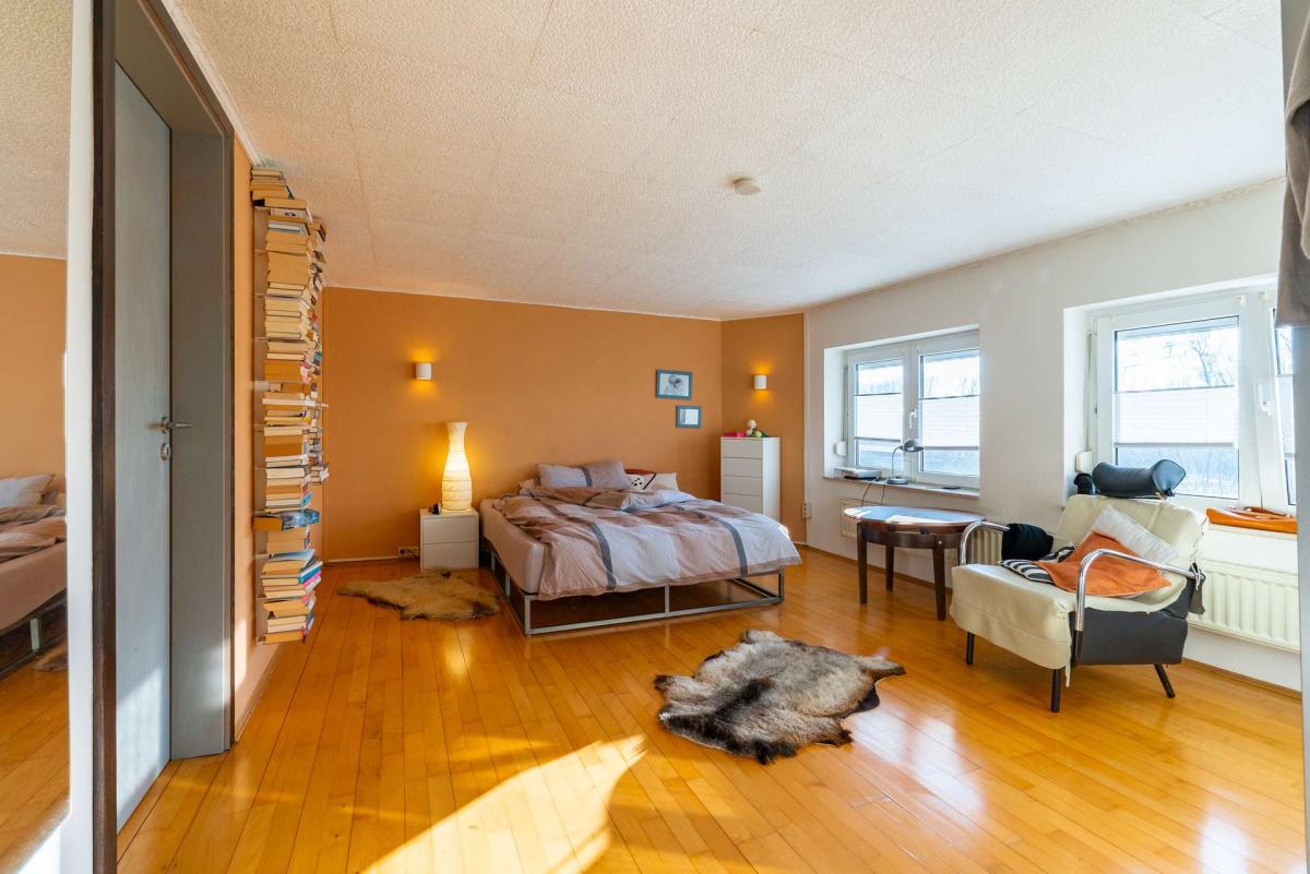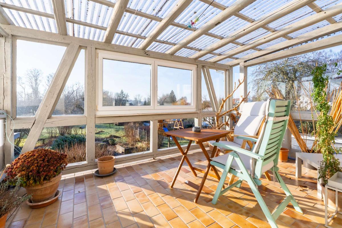 Zum Wohnbereich im Erdgeschoss gelangen Sie entweder über das Studio oder über den separaten Zugang rechtsseitig am Gebäude. Über das Treppenhaus erreichen Sie das 1. Obergeschoss, in dem sich die helle und großzügige Wohnung mit ca. 97 m² Wohnfläche befindet. Oben angekommen gelangen Sie linkerhand zum Tageslichtbad mit Dusche, zur Küche inklusive Einbauküche sowie zu einem derzeit als Büro genutzten Raum, der sich ebenso als Schlafzimmer anbietet. Rechterhand befindet sich das geräumige und helle Wohn-/Esszimmer mit Zugang zum nach Süden ausgerichteten Wintergarten. Angrenzend an das Wohnzimmer liegt das Schlafzimmer. Relativ mittig und zwischen Schlafzimmer und Büro gelegen, befindet sich ein großzügiger Abstellraum, der auch als Hobbyraum genutzt werden kann.