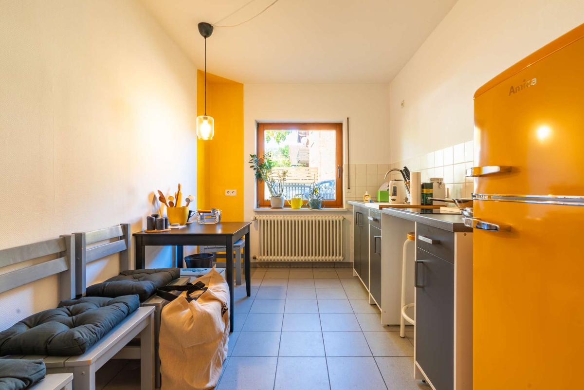 Im mittleren Gebäudeteil liegt die Hauptwohnung mit etwa 142 m² Wohnfläche, verteilt auf einen offenen Wohn Essbereich, ein Gäste WC im Erdgeschoss, das Hauptbad im Obergeschoss sowie drei Schlafräume und eine Dachterrasse. Die Küche der Hauptwohnung ist derzeit im Büroanbau untergebracht.