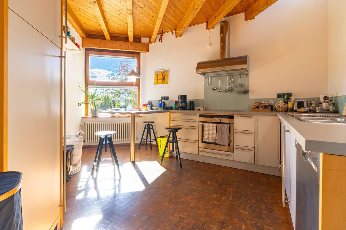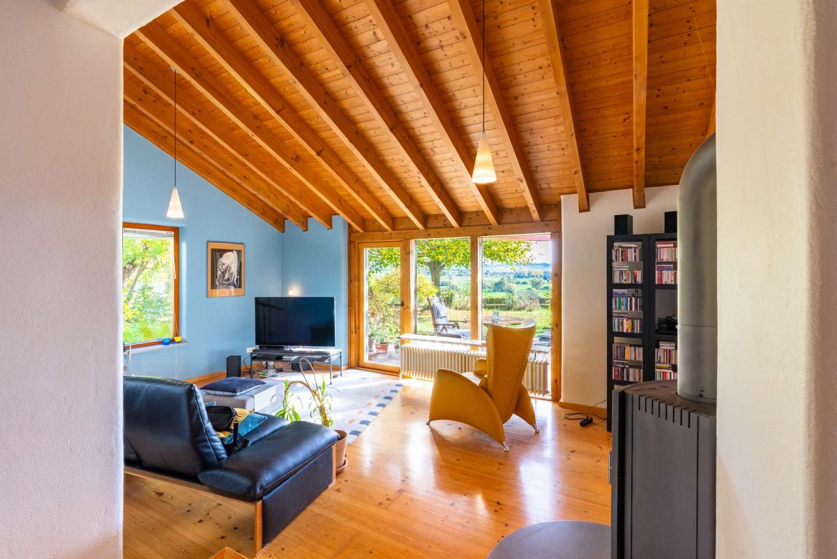 Auf etwa 197 m² Wohnfläche sowie rund 117 m² zusätzlicher Arbeits und Nutzfläche bietet die Immobilie großzügigen Raum für Wohnen, Arbeiten und kreative Entfaltung. Die Architektur überzeugt durch klare Linien, offene Raumstrukturen und große Fensterflächen, die viel Tageslicht hereinlassen. Sichtbare Holzelemente schaffen eine warme Atmosphäre und verleihen dem Haus seinen individuellen Charakter.