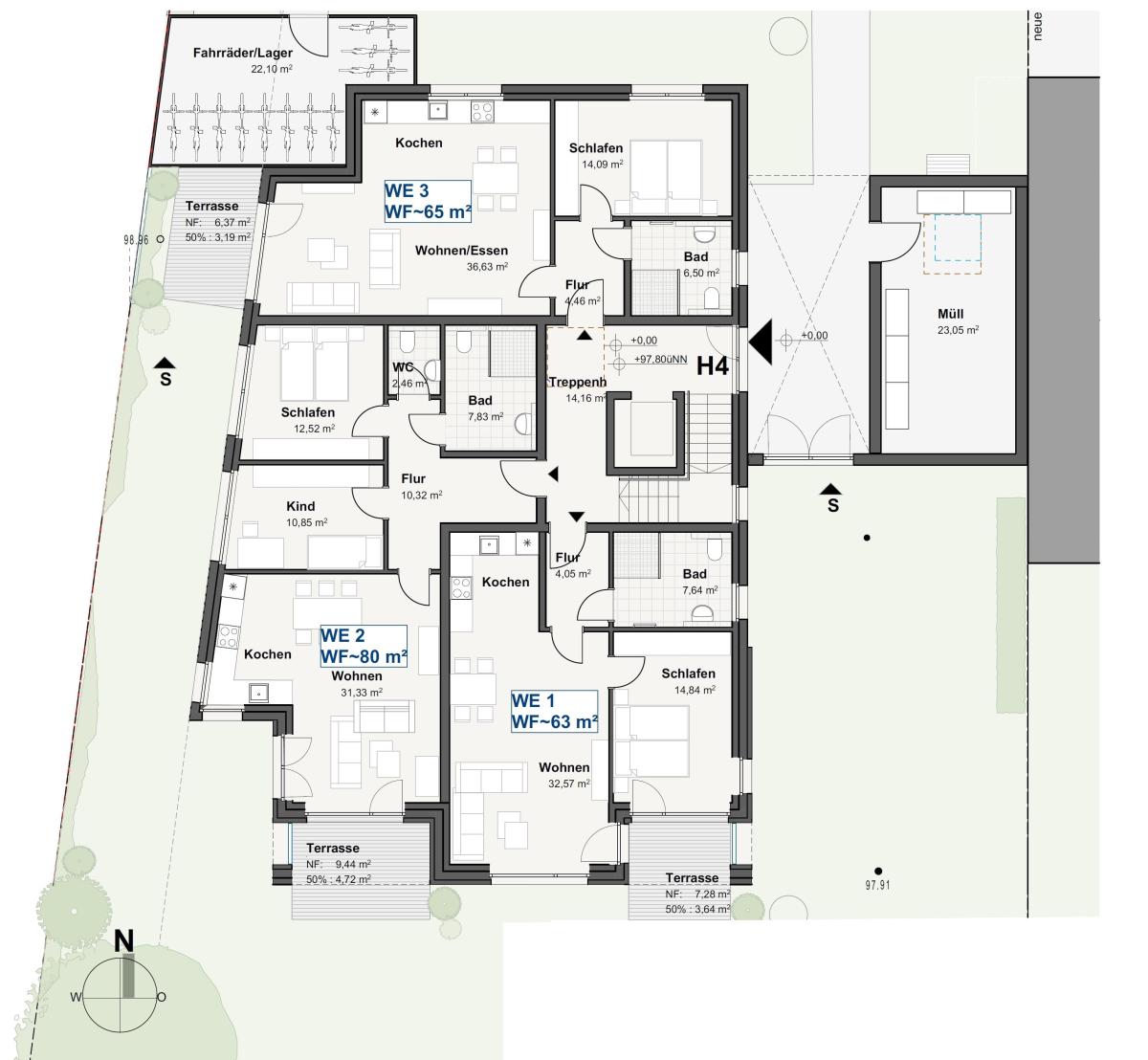 z.B. Wohnung Nr. 3, 2 ZKB Terrasse mit Gartenanteil im EG
