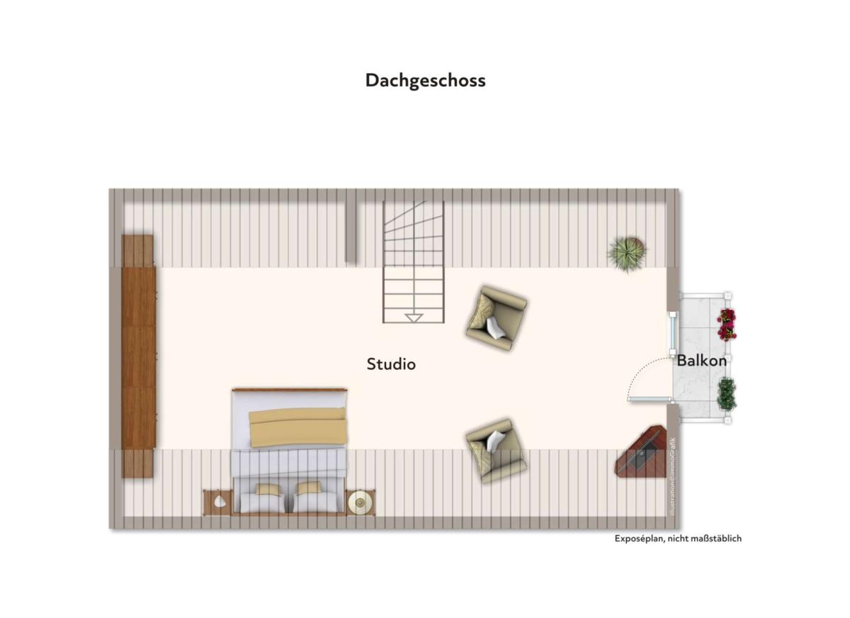 - Wohn- und Schlafbereich mit kleinem Balkon im Dachgeschoss