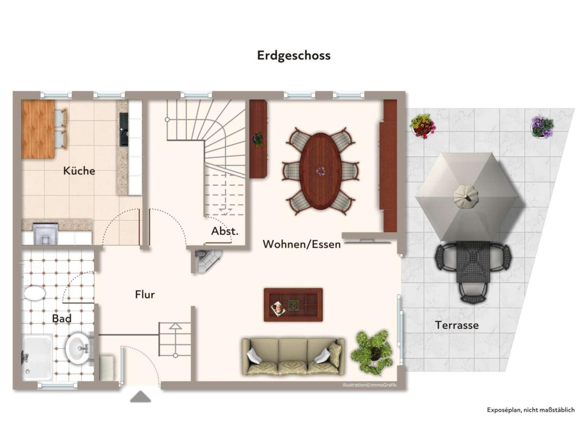 Im Erdgeschoss empfängt Sie das Haus mit einem freundlichen Eingangsbereich mit Zugang zu Badezimmer, Küche und zum gemütlichen Wohn-/Esszimmer sowie einem der Highlights, der schönen Terrassenfläche. Lassen Sie die Seele an sonnigen Tagen an diesem lauschigen Plätzchen baumeln. Die Küche ist ebenfalls urgemütlich ausgestattet und eingerichtet - klein, aber fein. Das Bad befindet sich mit Dusche, WC, Waschbecken und Waschmaschinenanschluss ebenfalls auf dieser Ebene.
