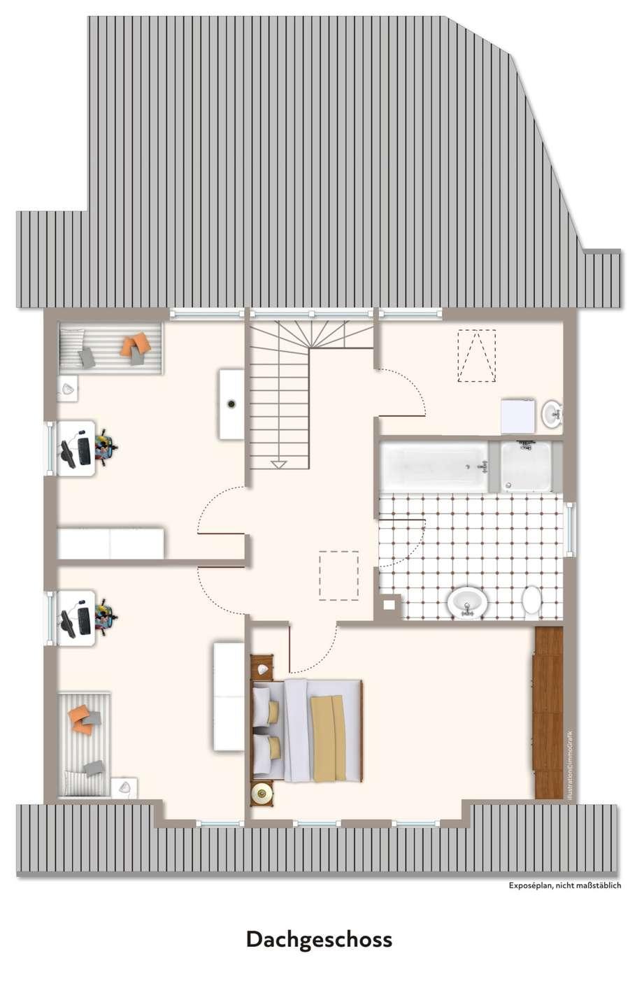 Im Dachgeschoss befinden sich das Tageslichtbad mit Dusche und Wanne sowie 3 weitere (Schlaf-)zimmer und ein Abstellraum mit Waschmaschinenanschluss.