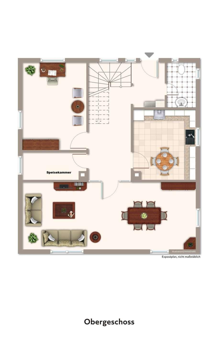 Im Obergeschoss stehen Ihnen die Küche in angenehmer Größe mit Essplatz, ein großer, offener Wohnbereich, ein Zimmer, das Gäste-WC und eine praktische Speisekammer zur Verfügung.