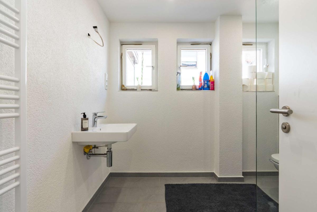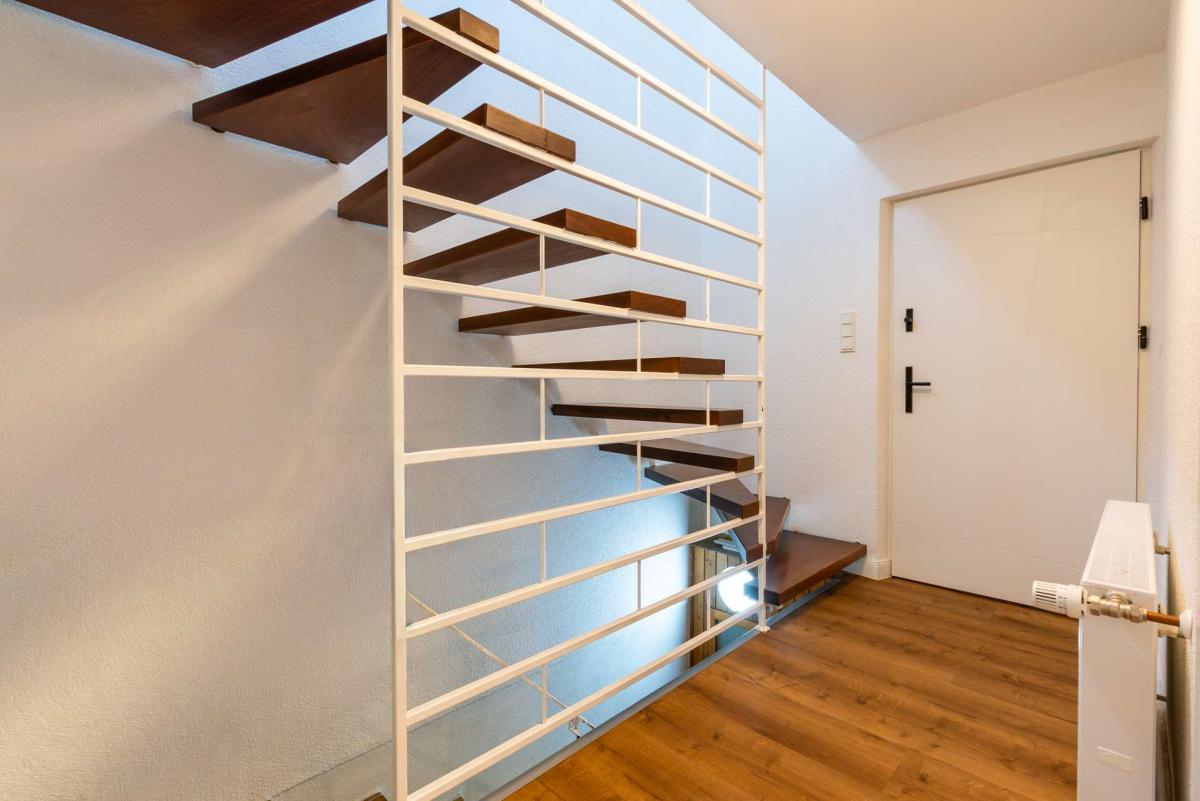 Das Haus ist über eine Hochparterre-Treppe zugänglich und führt in das Erdgeschoss mit einem großzügigen Wohn- und Essbereich, der direkten Zugang zur Loggia und in den Garten bietet. Ergänzt wird diese Ebene durch eine Küche inklusive hochwertiger Einbauküche, sowie ein helles Tageslichtbad mit Dusche. Vom Erdgeschoss aus besteht der Zugang sowohl ins Obergeschoss als auch in den Keller.