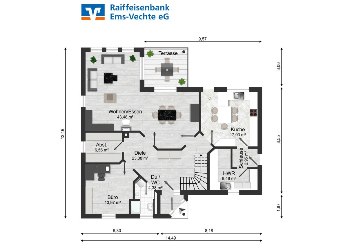 Schon beim Betreten des Hauses spürt man die offene, einladende Atmosphäre. Das Erdgeschoss mit ca. 121 m² Wohnfläche bildet den zentralen Lebensbereich. Der helle Wohn- und Essbereich mit Kamin ist das Herz des Hauses – ein Ort für gemeinsame Abende, gemütliche Stunden und besondere Momente. Von hier aus gelangen Sie direkt auf die überdachte Terrasse, die zu jeder Jahreszeit zum Verweilen einlädt. Die angrenzende Küche ist modern und gut geschnitten. Ein zusätzliches Schlaf- oder Allzweckzimmer bietet flexible Nutzungsmöglichkeiten – ideal als Gästezimmer, Homeoffice oder für ebenerdiges Wohnen. Abgerundet wird diese Ebene durch einen Hauswirtschaftsraum, einen Abstellraum sowie ein modernes Gäste-WC mit bodentiefer Dusche.