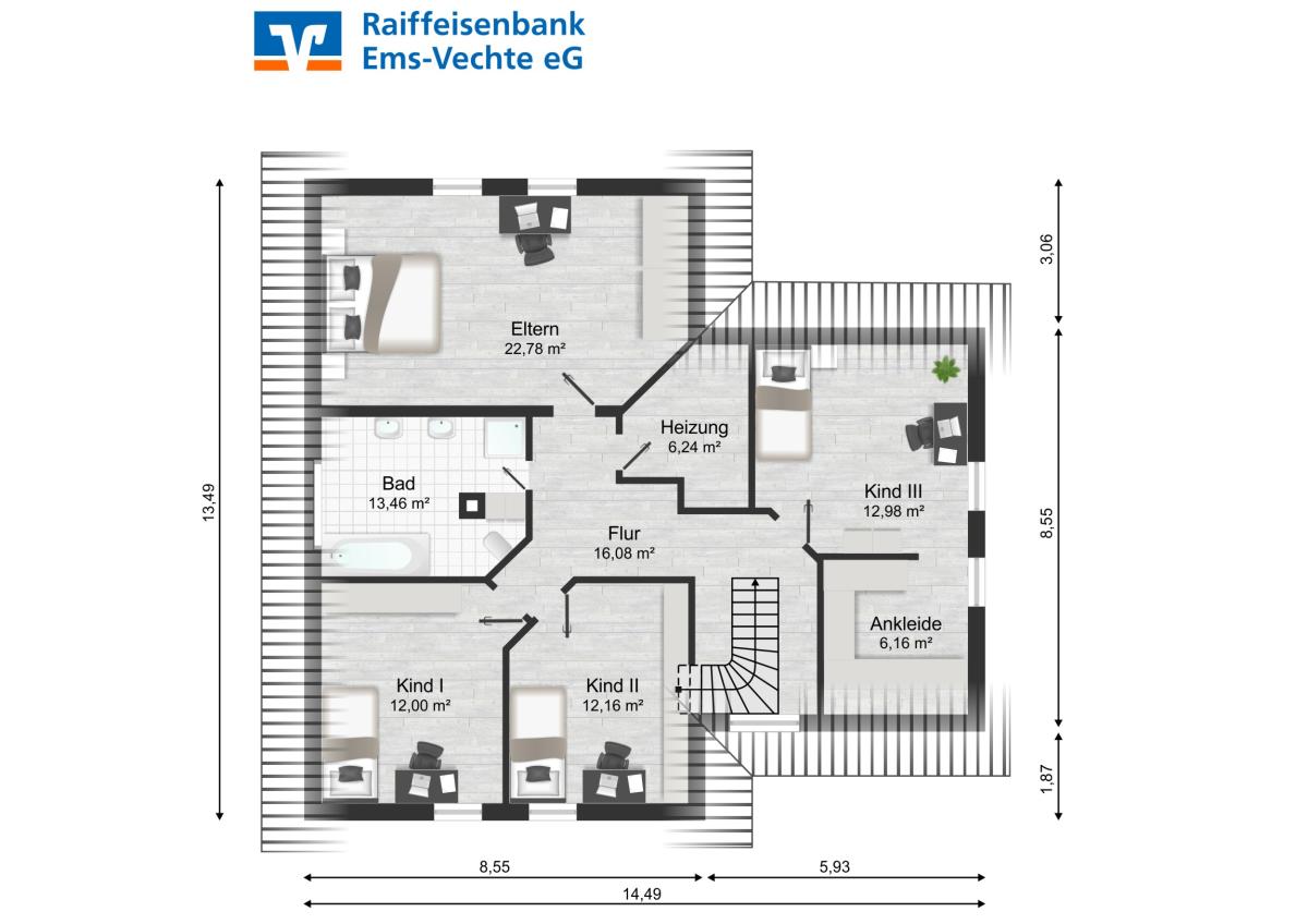 Im Dachgeschoss erwarten Sie auf ca. 101 m² vier gut geschnittene Schlafzimmer – Rückzugsorte für jedes Familienmitglied. Das großzügige Badezimmer mit ebenerdiger Dusche und Badewanne wird schnell zur privaten Wohlfühloase.