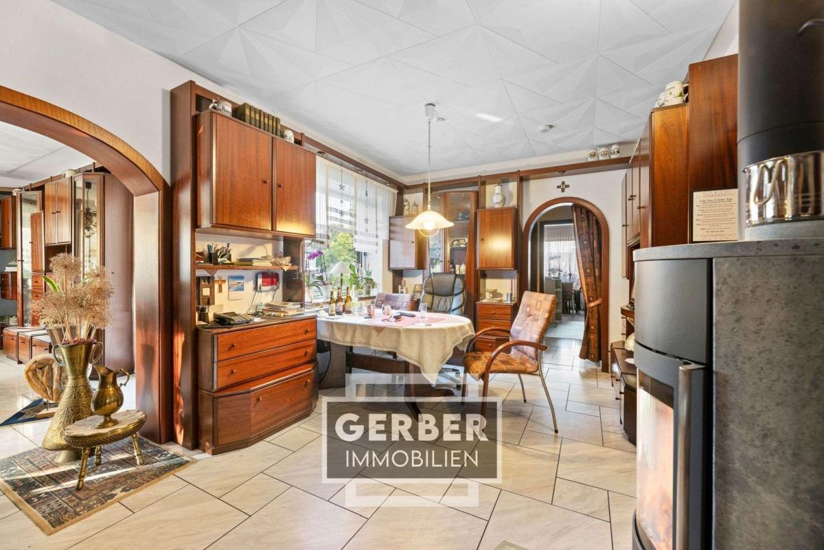 Im Erdgeschoss erwarten Sie 4 Zimmer, eine moderne Einbauküche, ein geräumiges Bad mit Dusche und Eckbadewanne sowie ein zusätzliches Gäste-WC mit Pissoir. Das Herzstück des Hauses ist das Wohnzimmer mit einem einladenden offenen Kamin, der für gemütliche Abende sorgt. Nebenan im Esszimmer flackert ein Kaminofen.