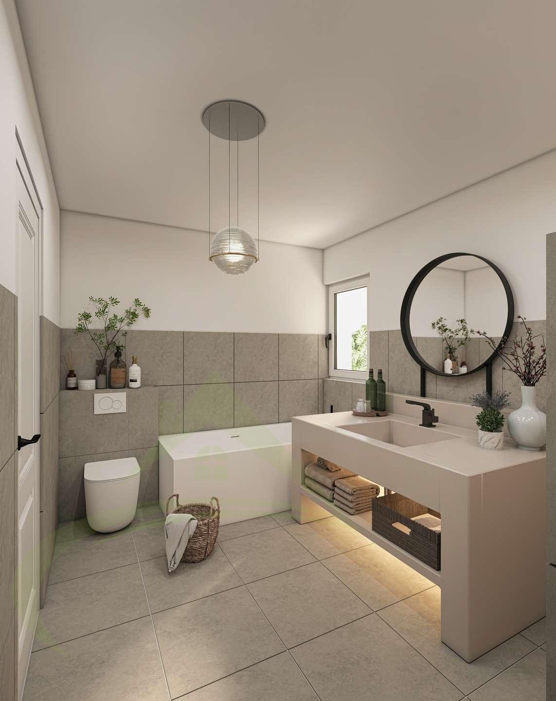 Sanitärbereiche & Haustechnikraum mit hochwertigen Fliesen (u. a. 30×60 cm), Fugen standardmäßig grau