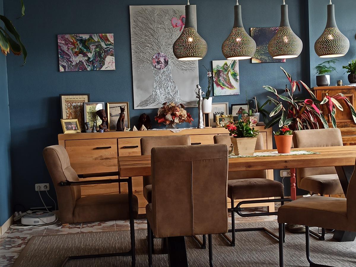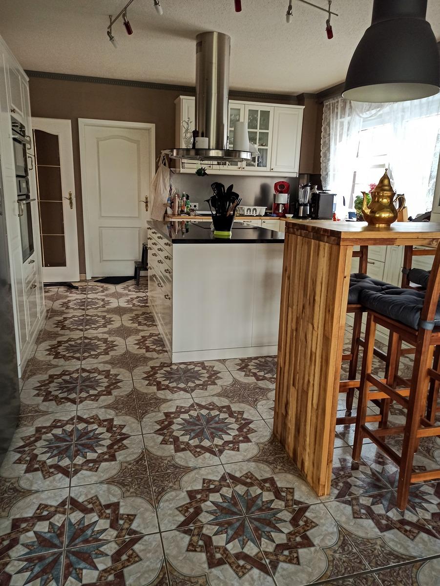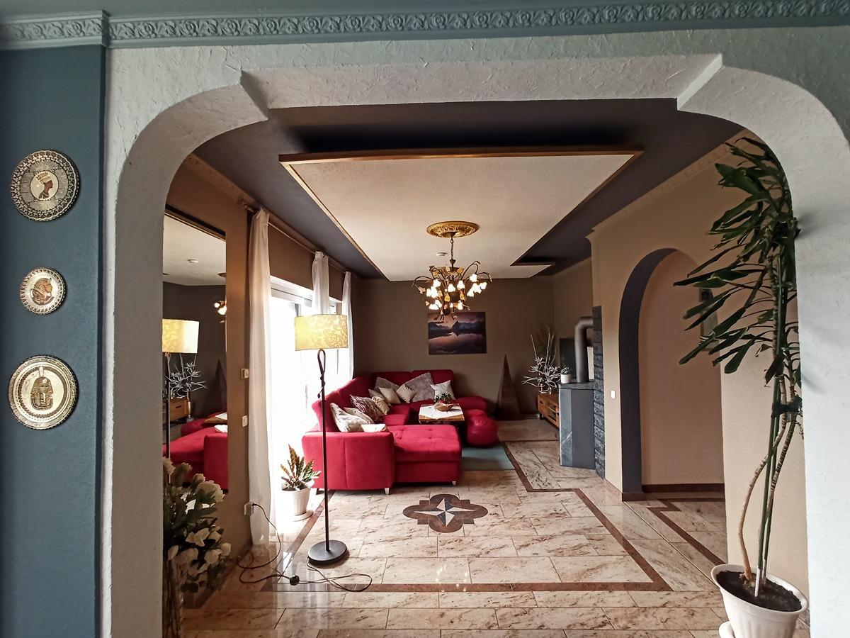 Mittelpunkt des Hauses ist der imposante Wohnraum mit Kaminofen, riesigem Essbereich, von dem der Blick in den Garten und den angrenzenden Wald immer gewährleistet ist. Die imposante traumhafte moderne Küche mit separatem Küchenblock lädt dazu ein, hier gemeinsam im Kreise der Familie zu agieren.