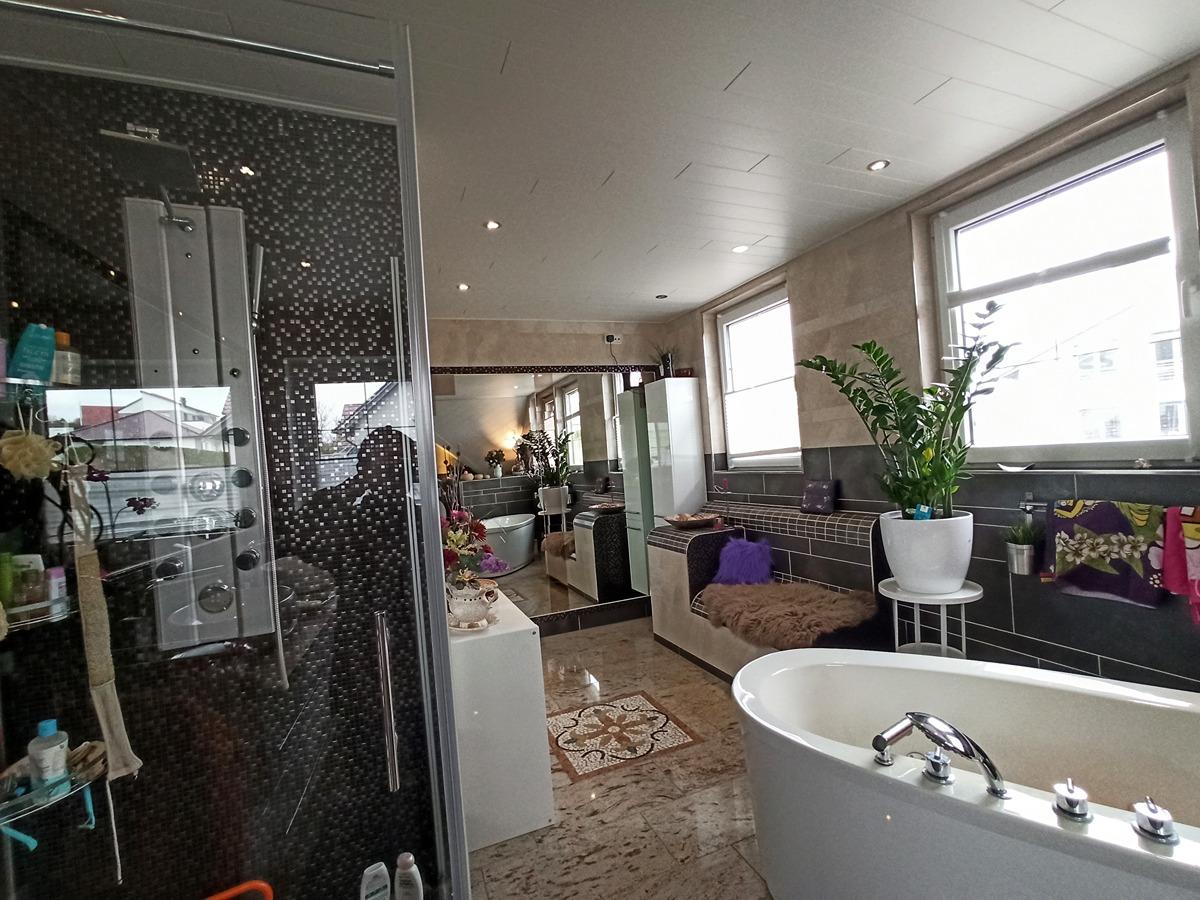 Unbeschreiblich schön ist der Bad- besser Wellnessbereich im Dachgeschoss, der beste Möglichkeiten bietet, in der freistehenden Badewanne einfach einmal „die Seele baumeln zu lassen“. Selbst ein Fernsehanschluss ist vorhanden.