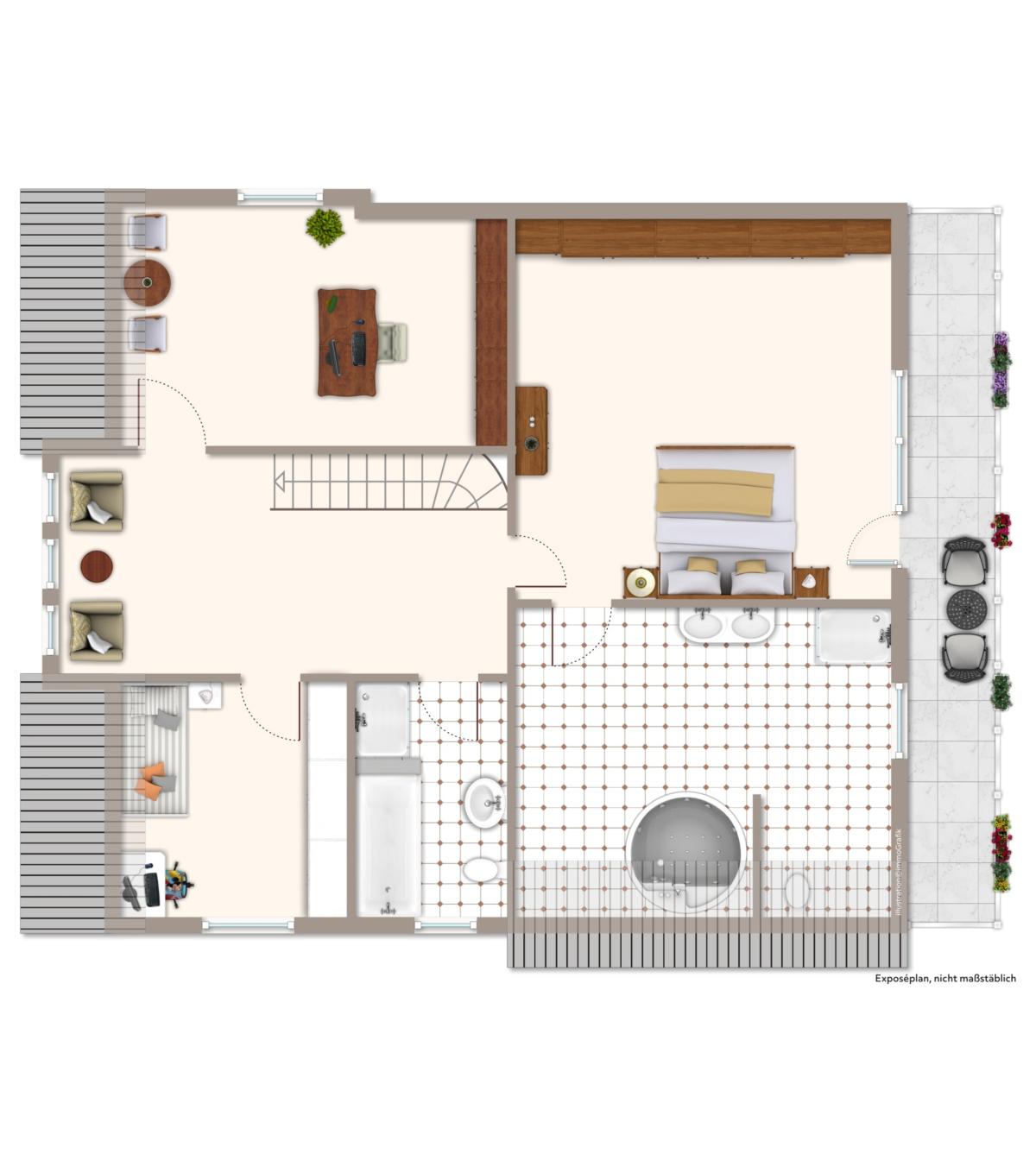 Dachgeschoss: 2 x Schlafzimmer, 1 x Büro, 1 x Bad mit Dusche und Wanne, 1 x Bad mit Dusche und Whirlpool, Balkon.