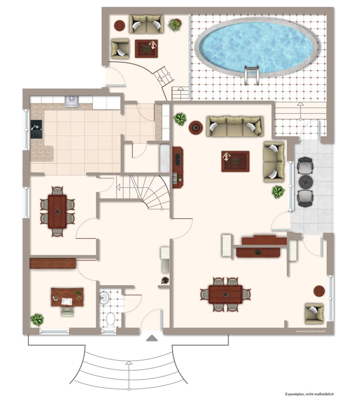 Erdgeschoss: 1 x Küche und offener Essbereich, 1 x Arbeitsküche, 1 x Abstellraum, 1 x Büro, 1 x Gäste-WC, 1 x großzügiges, geschmackvoll eingerichtetes Wohnzimmer mit Kamin und angrenzendem Esszimmer - sowie weiterer Sitzbereich mit zweitem Kamin, Swimming-Pool und Wellnessbereich.