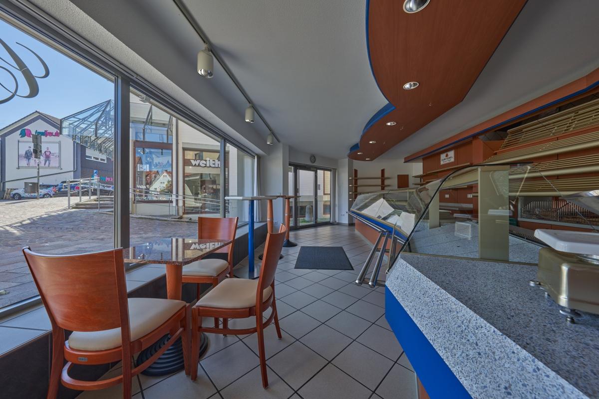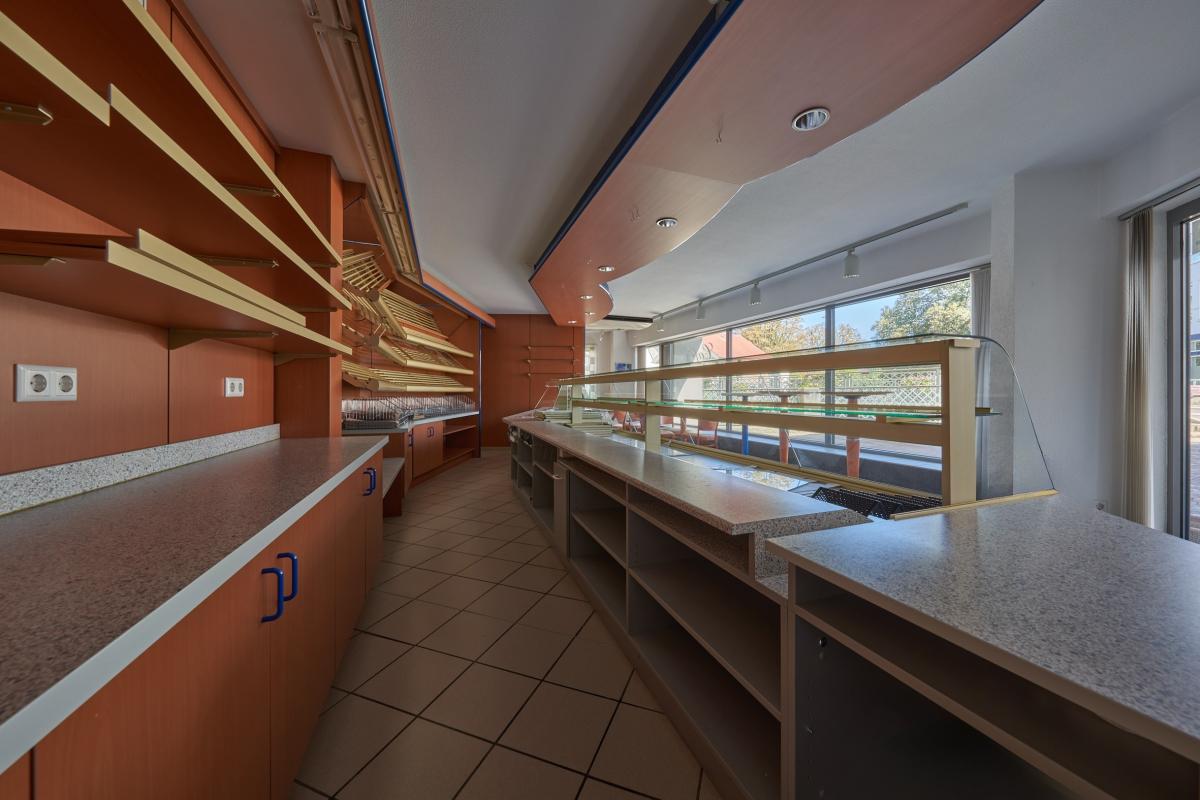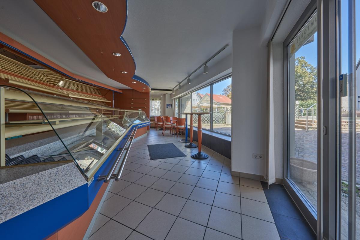 Es handelt sich um ein ehemaliges Bäckereifachgeschäft mit angeschlossener Backstube. Die moderne Ladeneinrichtung befindet sich in einem sehr guten Zustand und kann einer neuen Verwendung zugeführt werden. Das Ladengeschäft ist über die große und erneuerte Schaufensterfront und den verglasten Eingangsbereich sehr gut belichtet und einsehbar und bietet einen repräsentativen Verkaufsraum. Auf der gleichen Ebene befindet sich noch ein Aufenthalts-/Küchenbereich, der auch über den Hausflur zugänglich ist.