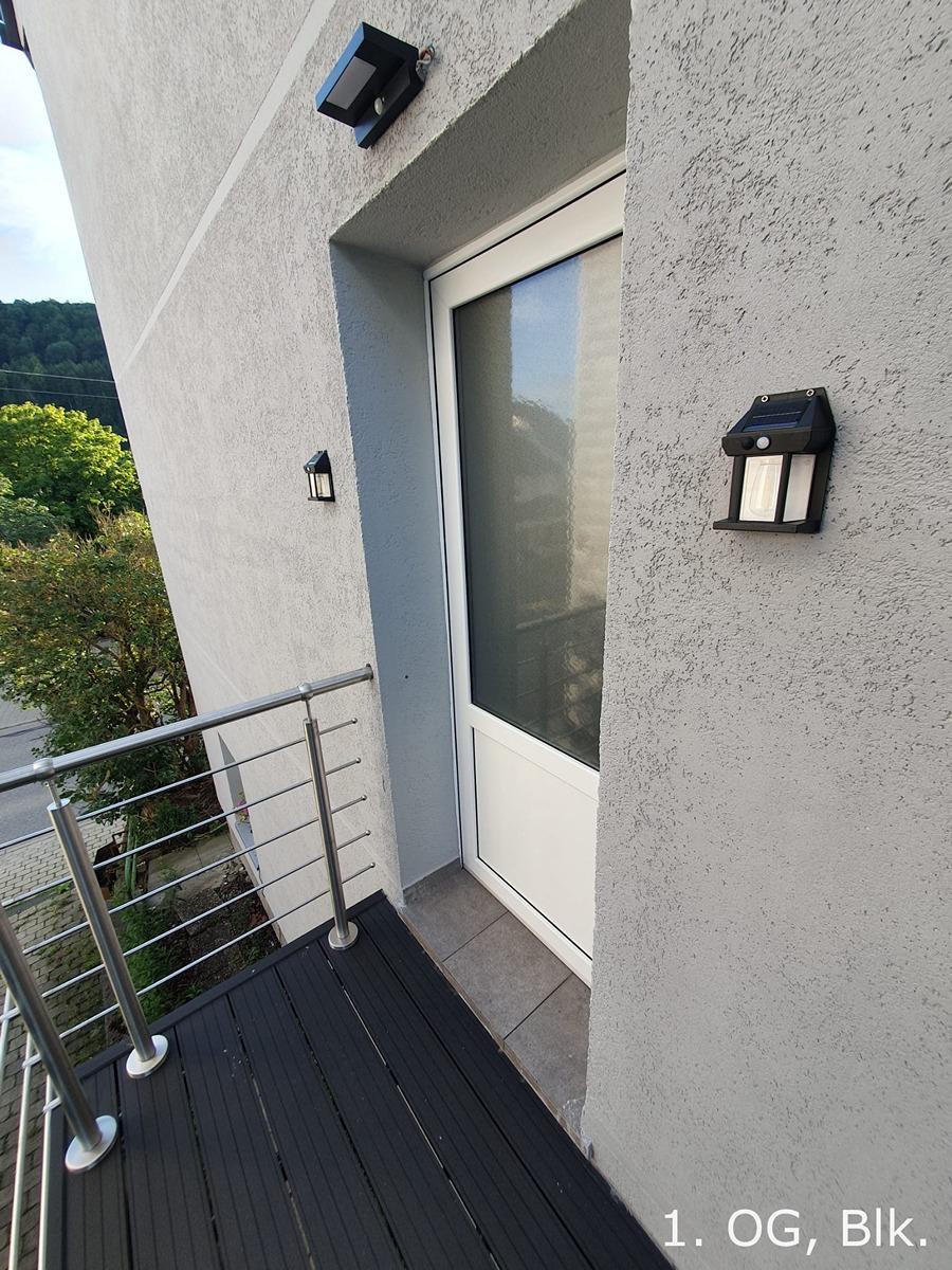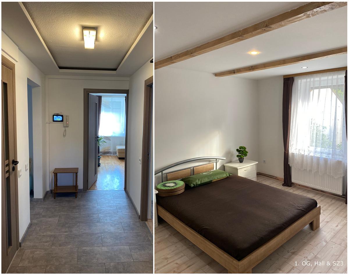 - 1. OG (Höhe zw. 2,26 m – 2,34 m): Wohnzimmer, Küche, 3 Schlafzimmer, Badezimmer (Dusche), Hall, Flur, Gäste WC, Abstellraum, 2 Eingänge: Haupt Eingang über die Innentreppe (Breite 2,15 m, Höhe 2,32 cm) sowie seitliche Außentreppe, zusätzlicher Zugang über den Balkon