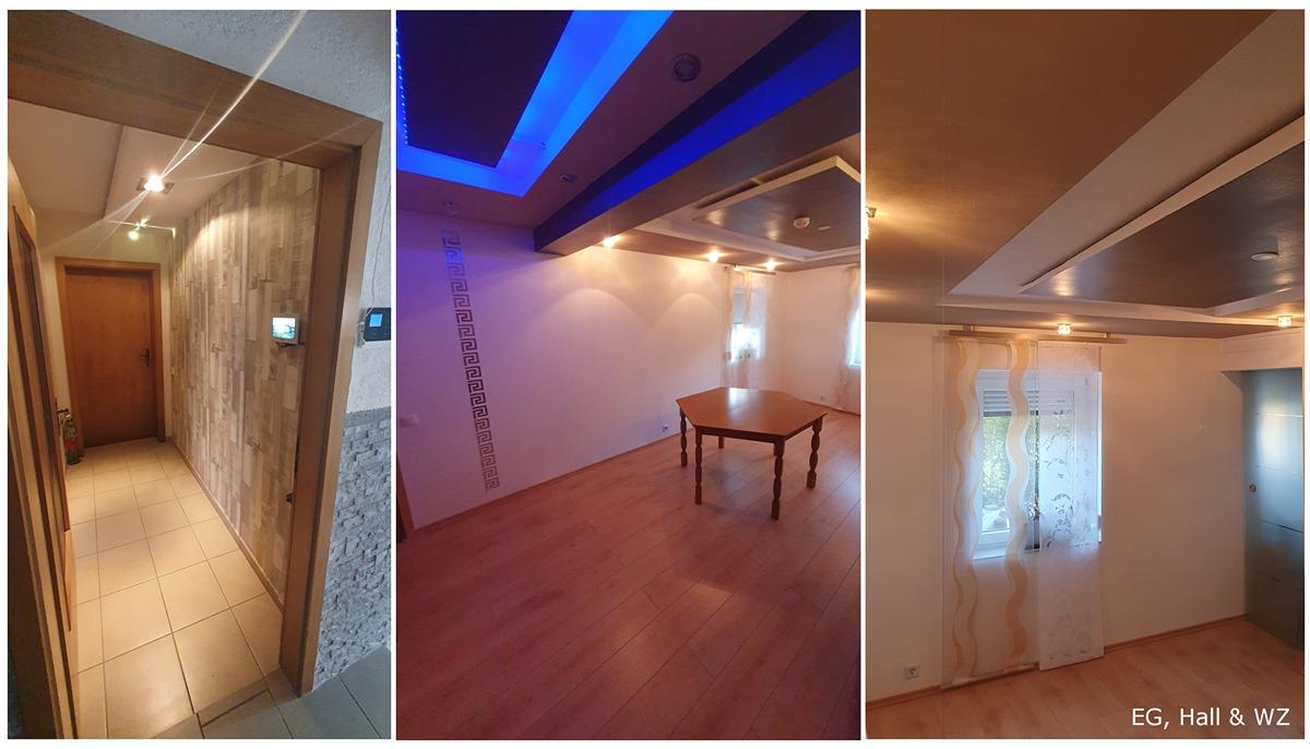- EG (Höhe zw. 2,26 m – 2,46 m): Wohnzimmer, Küche, 2 Schlafzimmer, Badezimmer (Dusche + Badewanne), Hall, Gäste WC, Schuppe, Heizungs-/Technikraum, Flure, Keller, Wintergarten