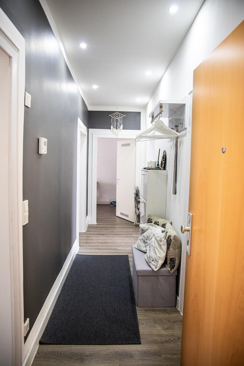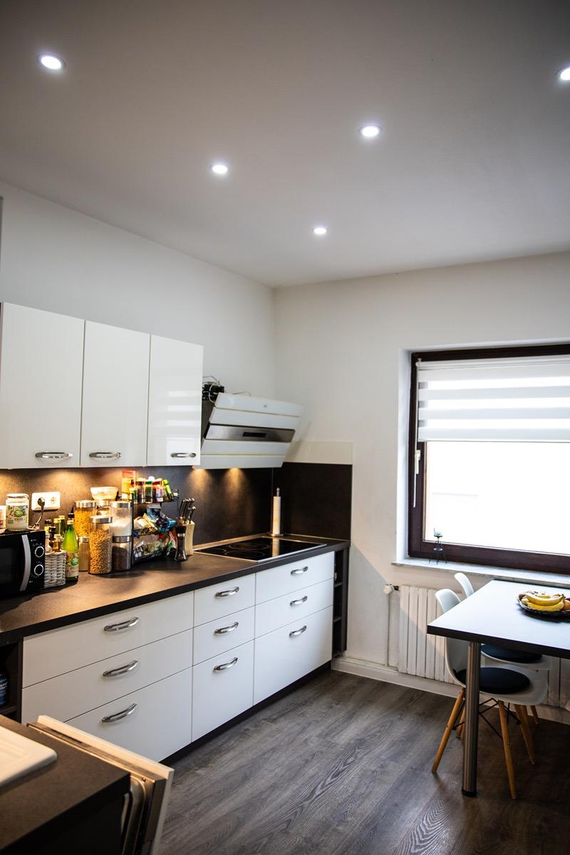 In allen Wohnräumen (außer Bad) sind moderne LED-Deckenspots integriert. Das Wohnzimmer überzeugt zusätzlich durch eine stilvoll abgehängte Decke, die dem Raum eine moderne und angenehme Atmosphäre verleiht. Als Bodenbelag wurde ein hochwertiger Vinylboden gewählt.