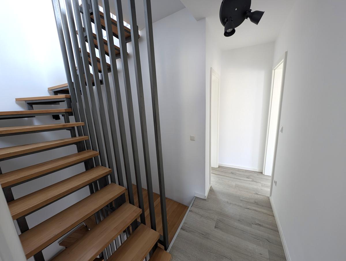 Ein besonderes Highlight der Immobilie ist die großzügige Dachterrasse mit ca. 12 m², von der aus sich ein beeindruckender Blick auf die Weinheimer Burg genießen lässt. Der Bodenbelag aus Laminat und Fliesen sorgt für ein modernes und zugleich pflegeleichtes Wohnambiente. Die Ebenen der Wohnung sind über eine freitragende Stahltreppe mit Holzstufen verbunden, die dem Objekt eine moderne architektonische Note verleiht.