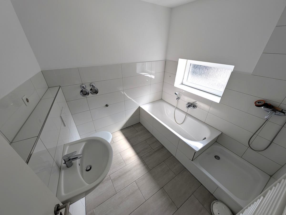 Das Tageslichtbad präsentiert sich in zeitlos moderner Optik und ist mit Dusche, Badewanne, WC und Waschtisch ausgestattet. Großformatige, helle Fliesen unterstreichen den hochwertigen Gesamteindruck. Zusätzlich steht ein separates Gäste-WC zur Verfügung.