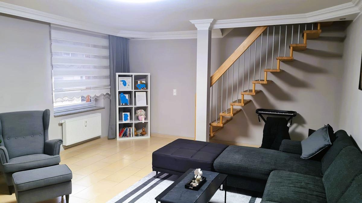 Beim Betreten der Wohnung empfängt Sie eine geräumige Diele mit ausreichend Platz für eine Garderobe. Die untere Wohnebene verfügt über einen großzügigen Wohn- und Essbereich, der als zentraler Lebensmittelpunkt der Wohnung dient und viel Raum für gemeinsames Wohnen bietet. Angrenzend befindet sich die großzügig geschnittene Küche. Von hier aus gelangen Sie auf den Balkon mit Blick in den ruhigen Hintergarten. Ein weiß gefliestes Gäste-WC mit Dusche rundet diese Etage ab.